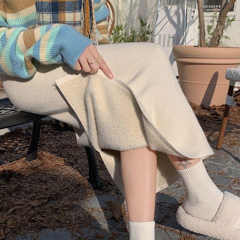 Женская вязаная юбка-полусолнце из толстого флиса с подкладкой из меха норки, однотонная, универсальная, минималистичная, с высокой талией, облегающая, карандаш, прямая, с разрезом
