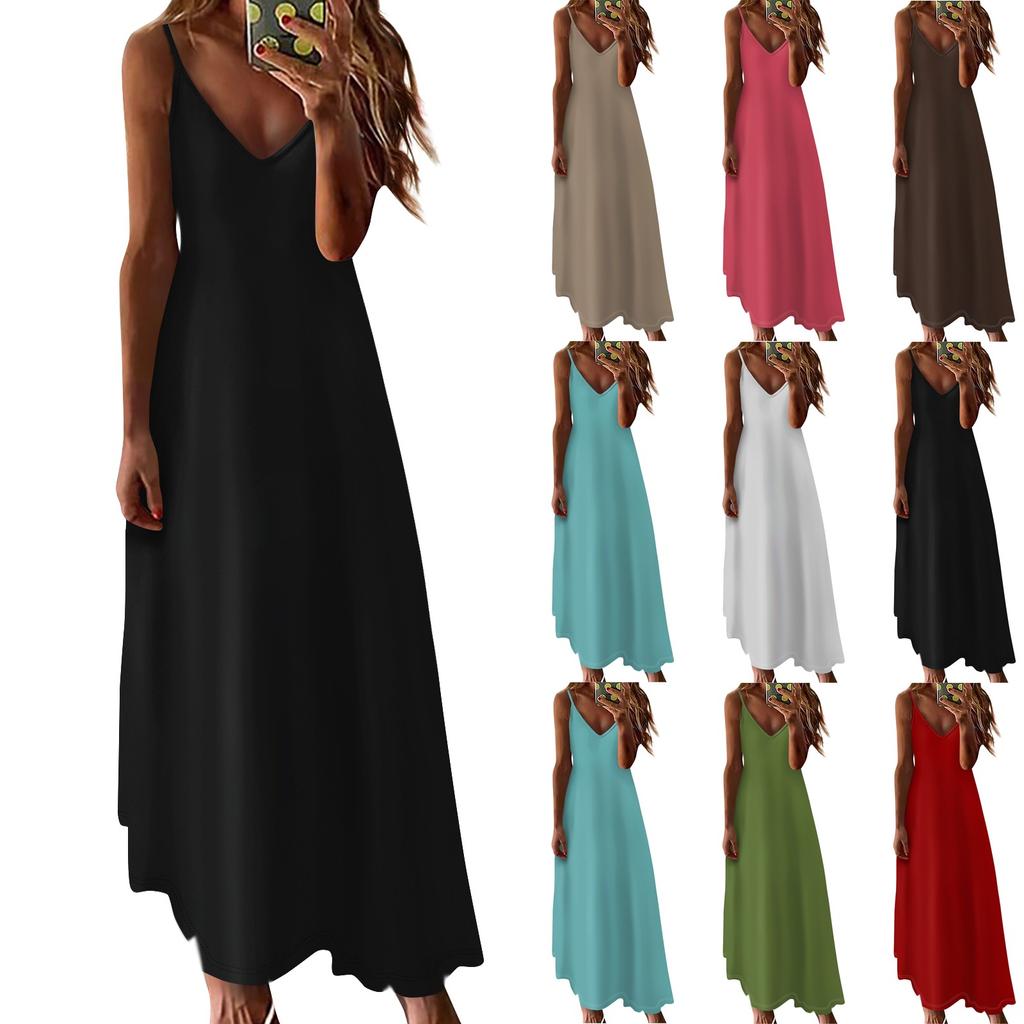 Женское летнее повседневное модное однотонное длинное платье без рукавов с V-образным вырезом, повседневные платья — купить товар онлайн с бесплатной доставкой до всему миру!
