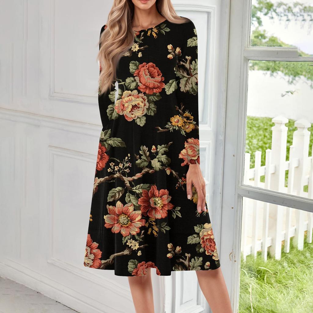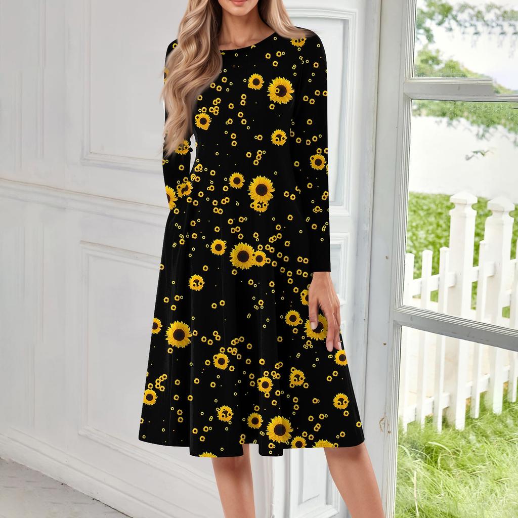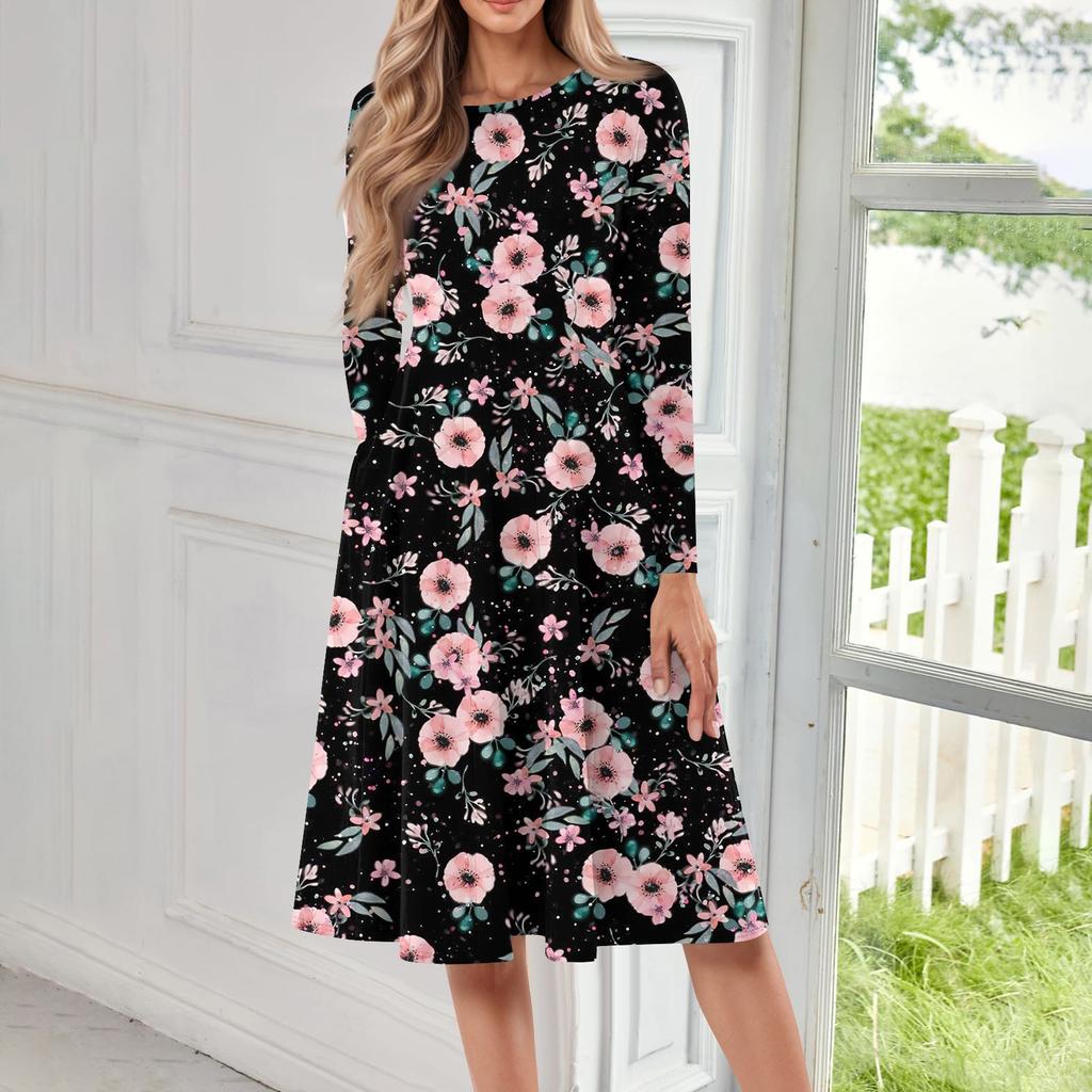 Женское повседневное модное платье миди с круглым вырезом и длинными рукавами