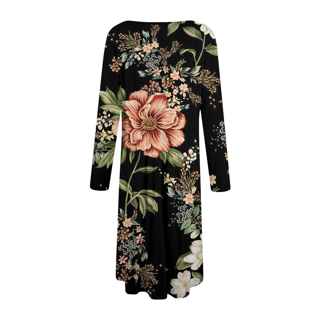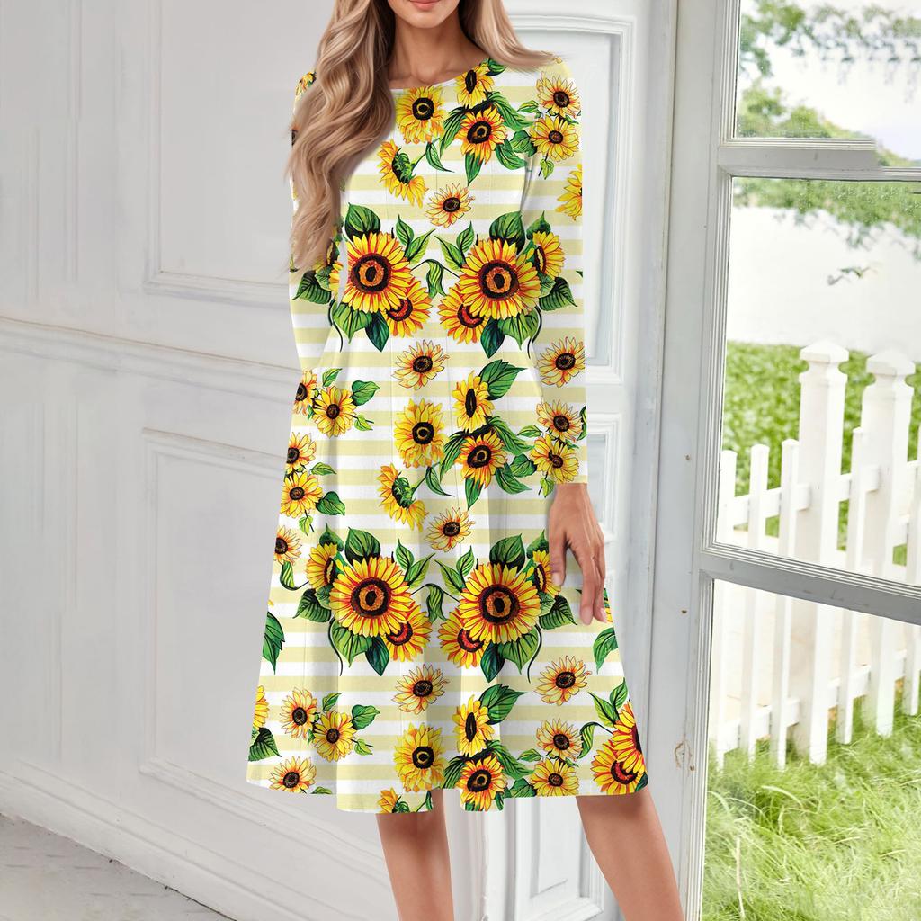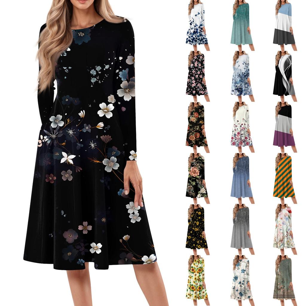 Женское повседневное модное платье миди с круглым вырезом и длинными рукавами