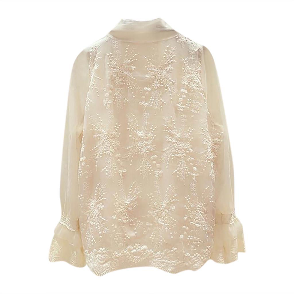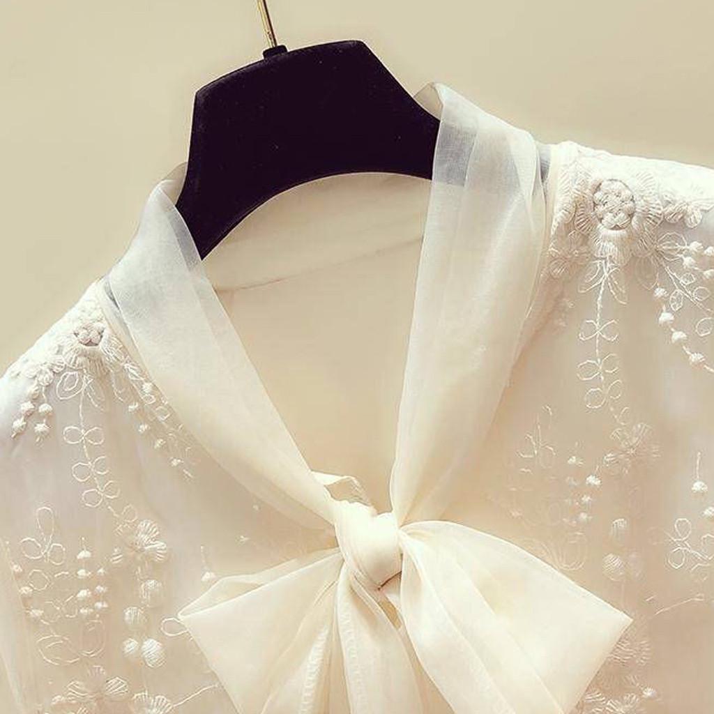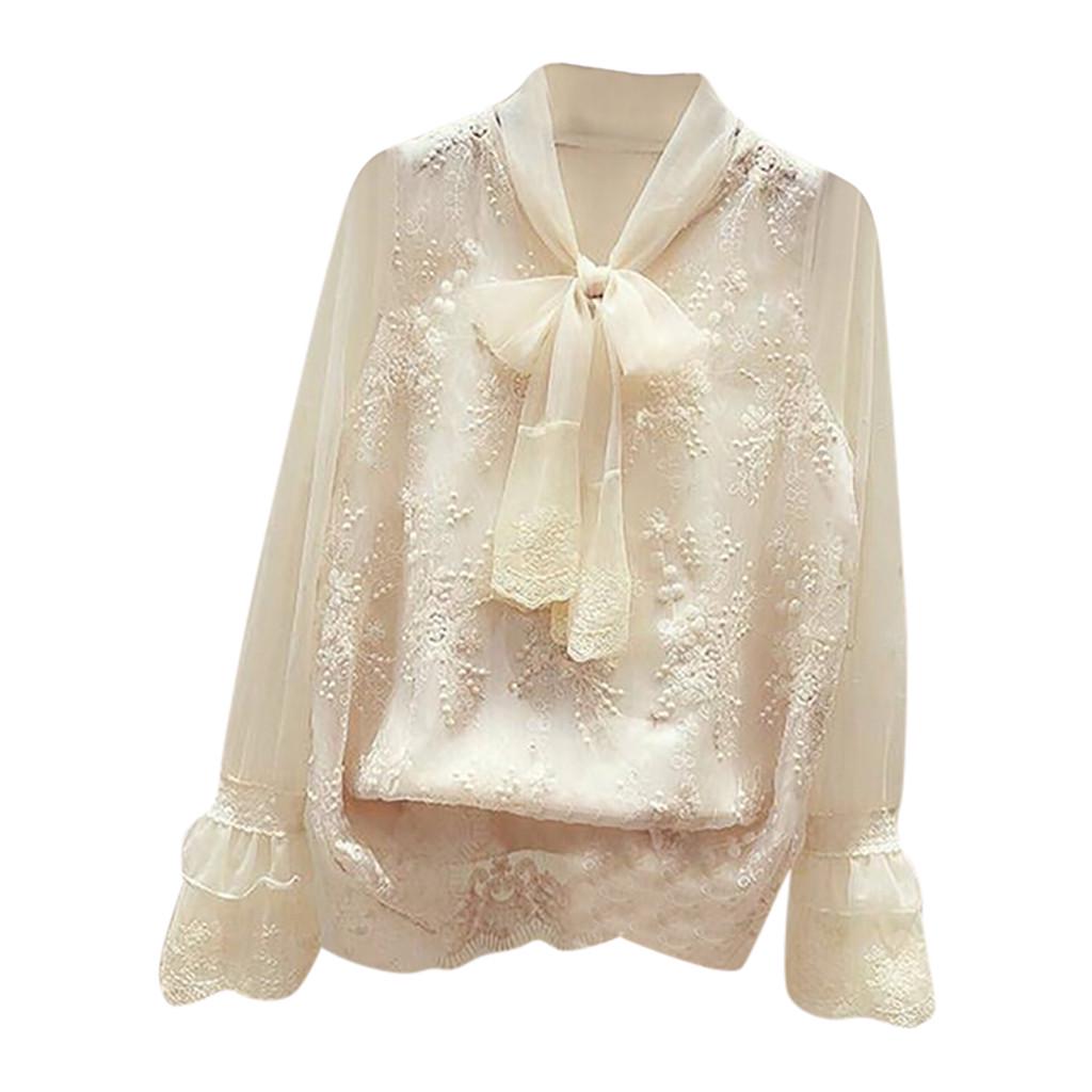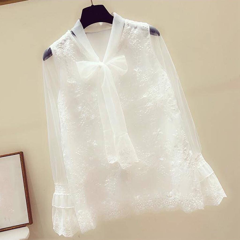 Модные женские повседневные топы с длинным рукавом и цветочным кружевным бантом с v-образным вырезом, однотонные женские рубашки