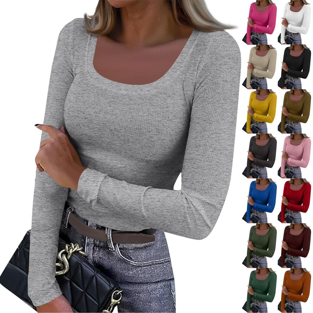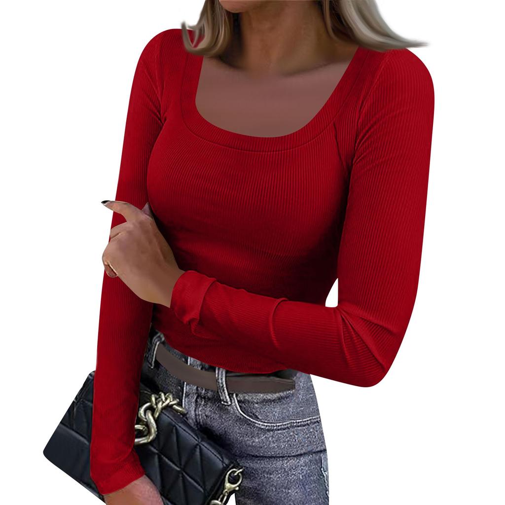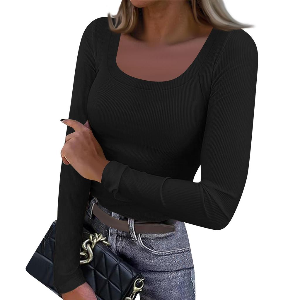 Женская и зимняя футболка с тонким низом, модная повседневная однотонная футболка с квадратным вырезом, длинный рукав