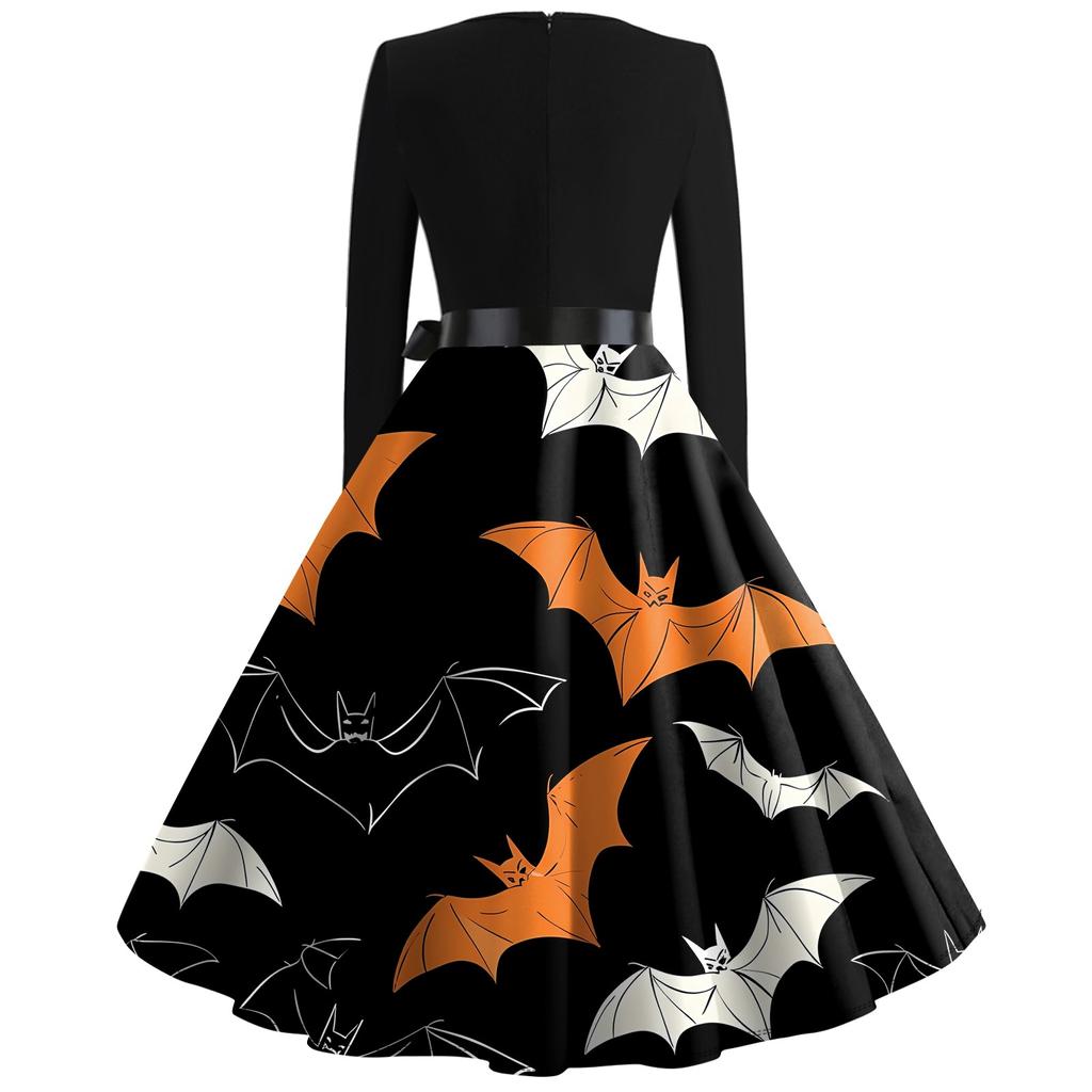 Платье с расклешенным принтом на Хэллоуин для женщин, платье с длинным рукавом, полые вечерние повседневные платья