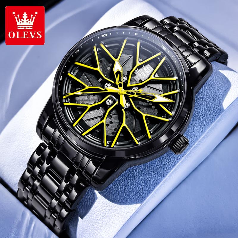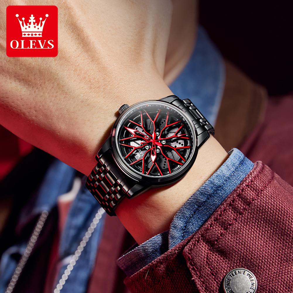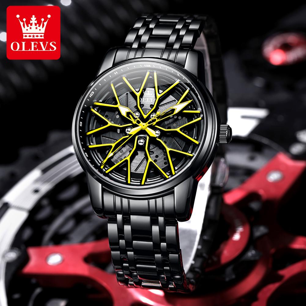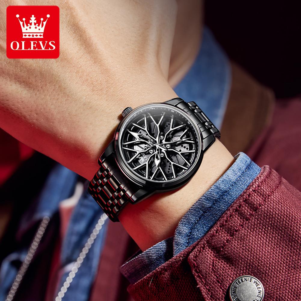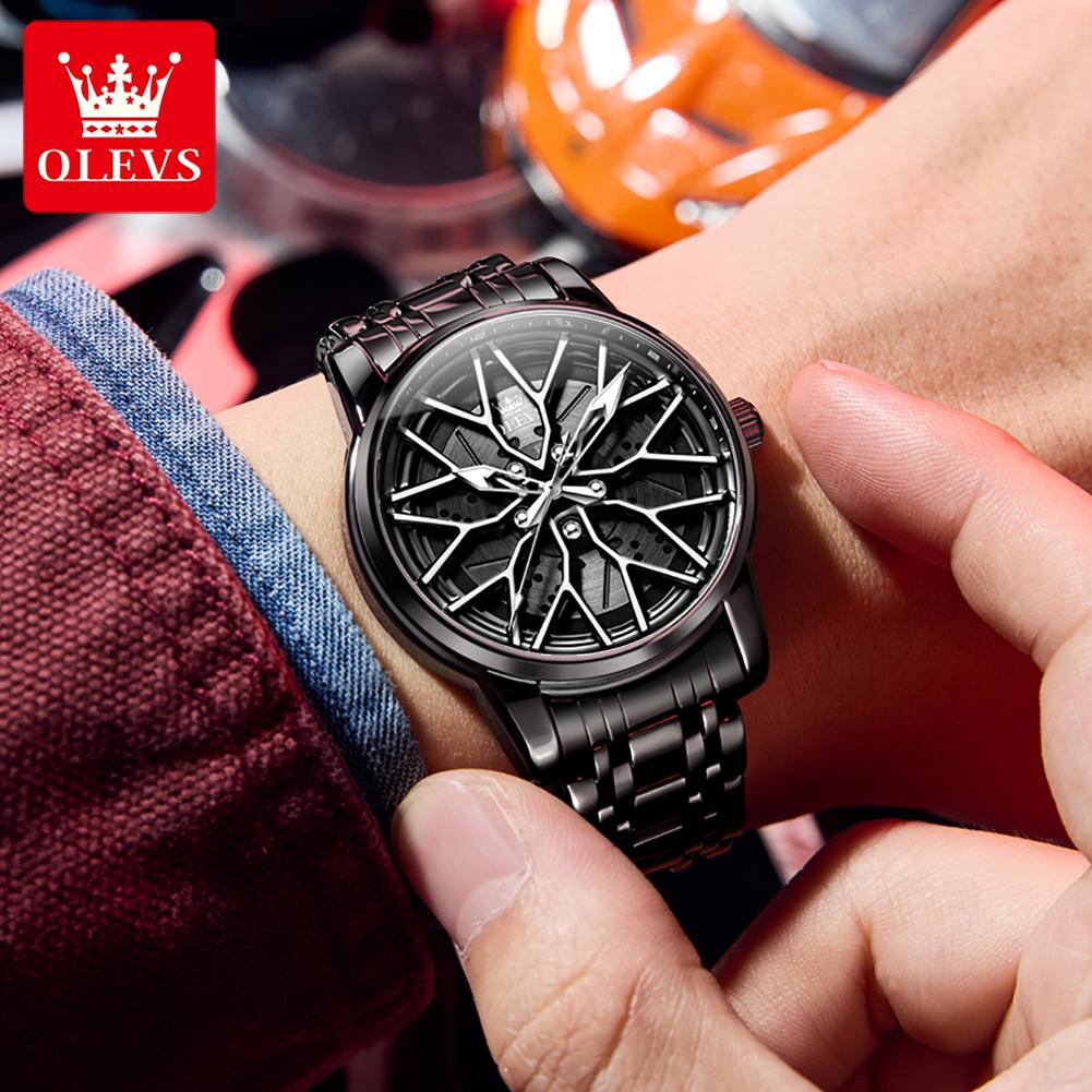OLEVS Модные мужские часы Спортивный циферблат в виде колесного диска автомобиля Вращающийся на 360° Кварцевые часы Водонепроницаемые Наручные часы из нержавеющей стали