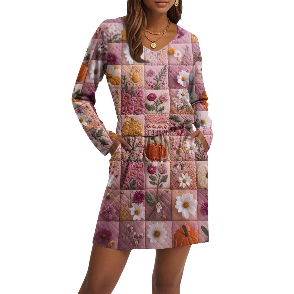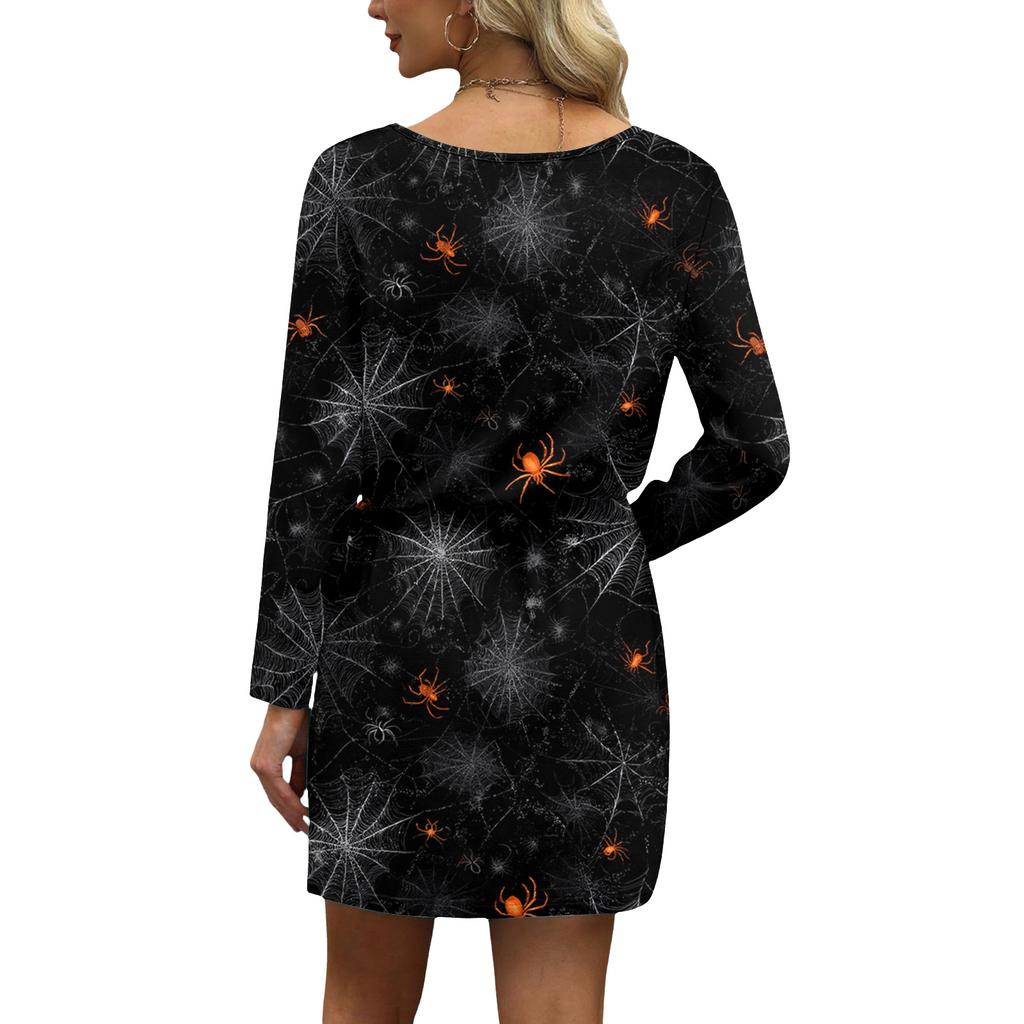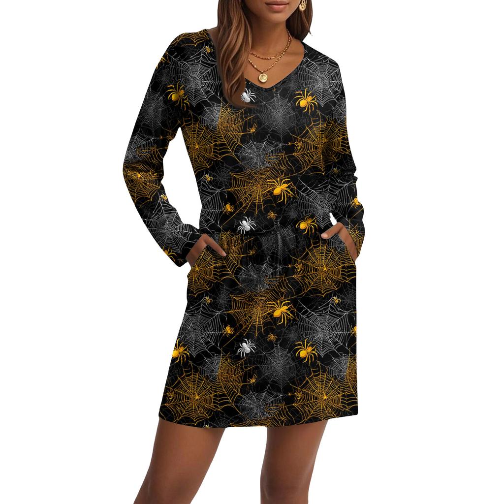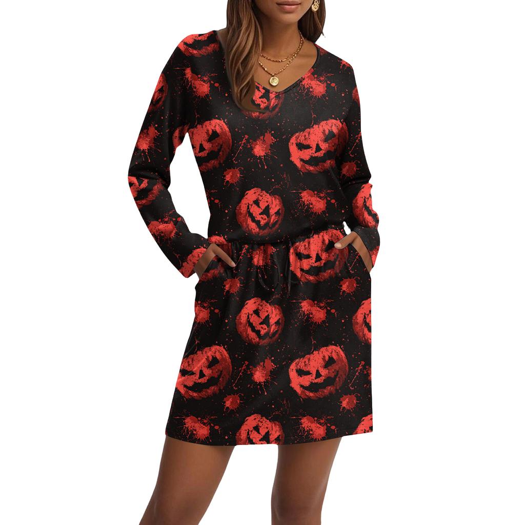 Женское модное платье с V-образным вырезом, длинными рукавами, кулиской, карманом и принтом на Хэллоуин