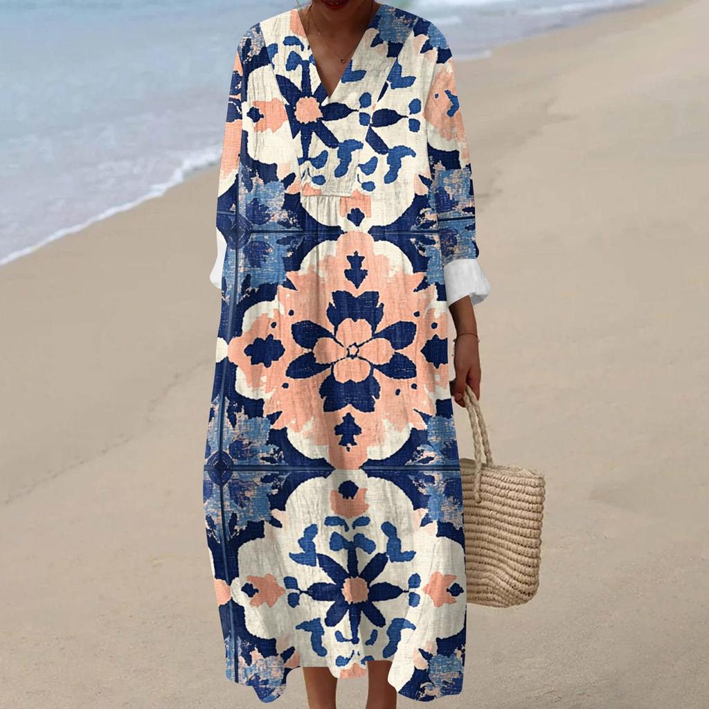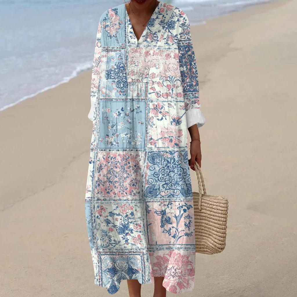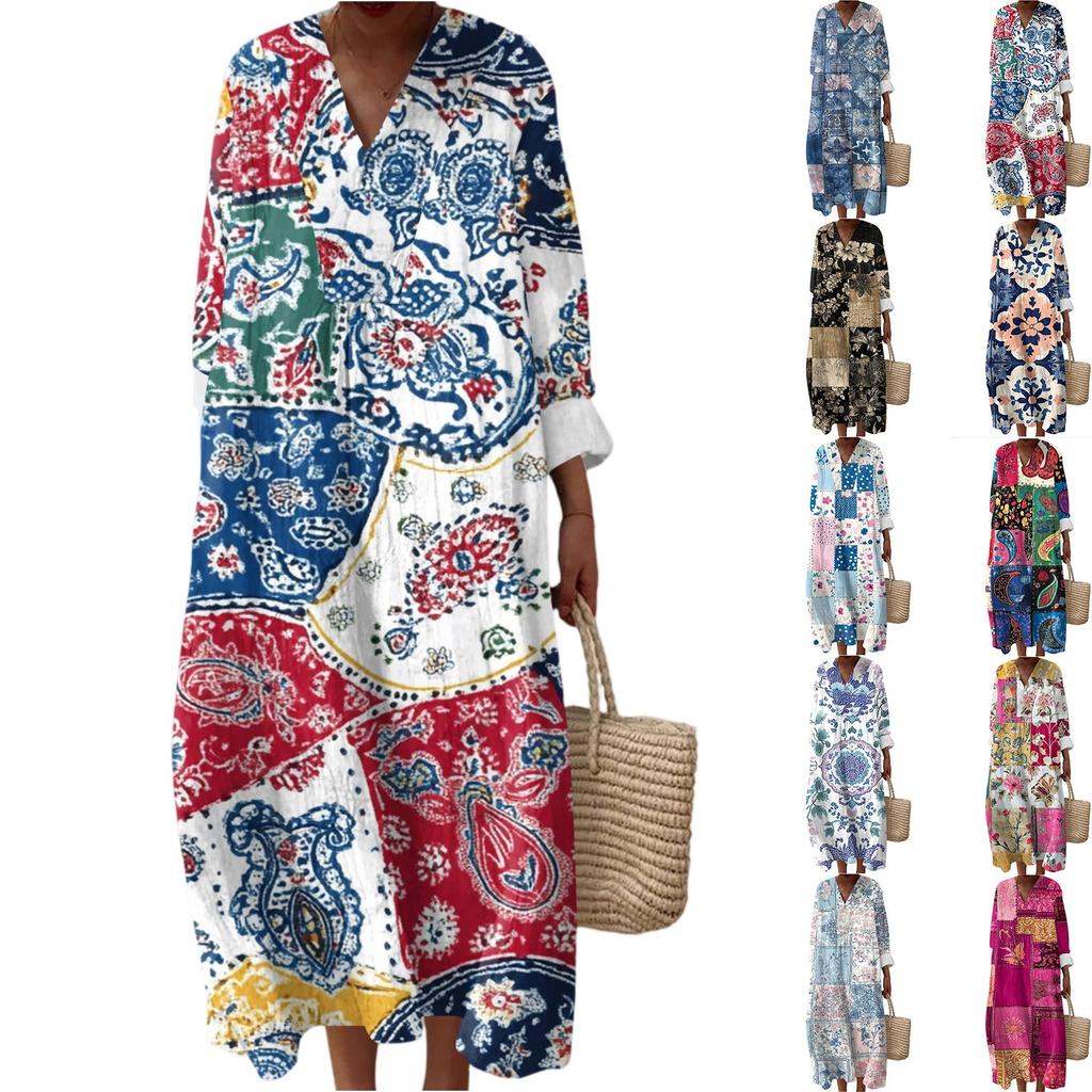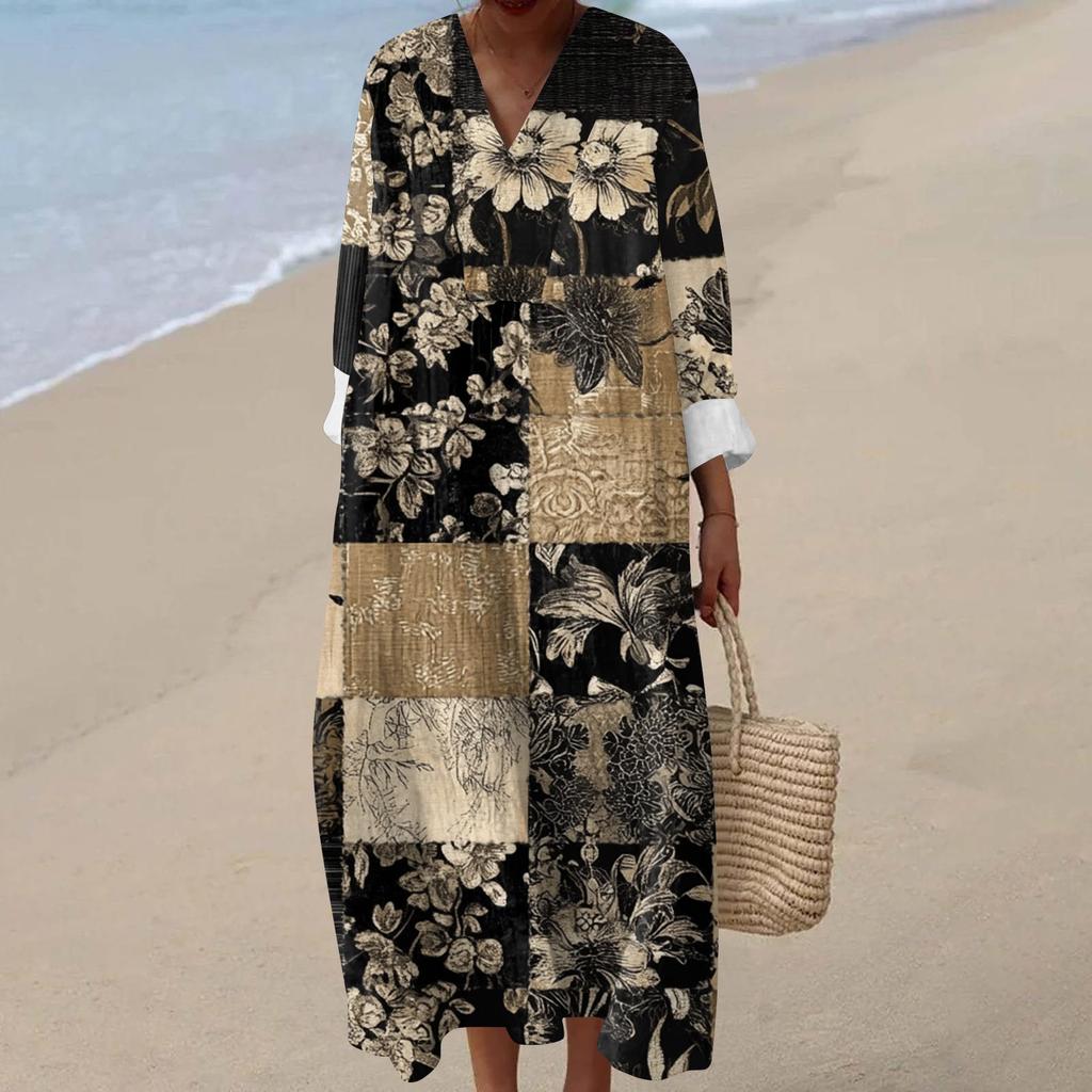Женское повседневное модное платье макси с V-образным вырезом и длинными рукавами с цветочным принтом