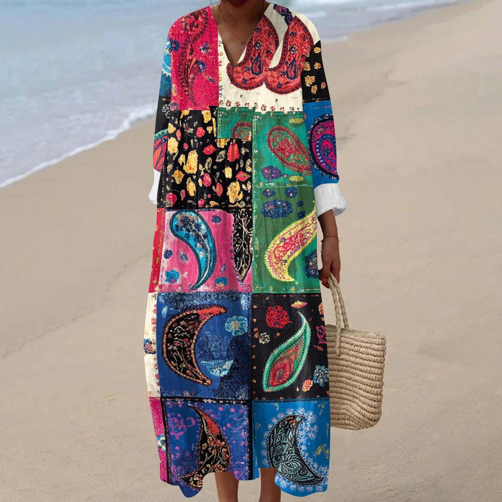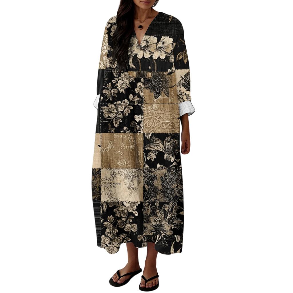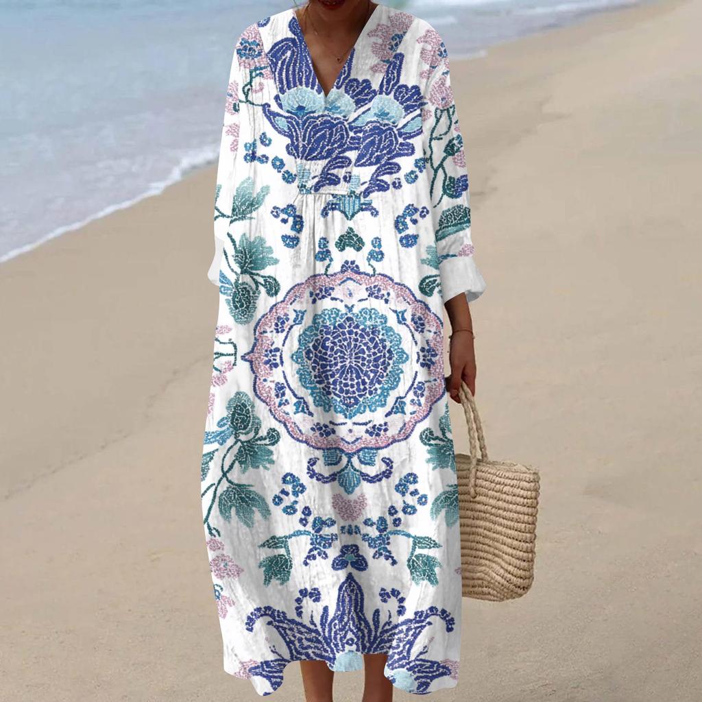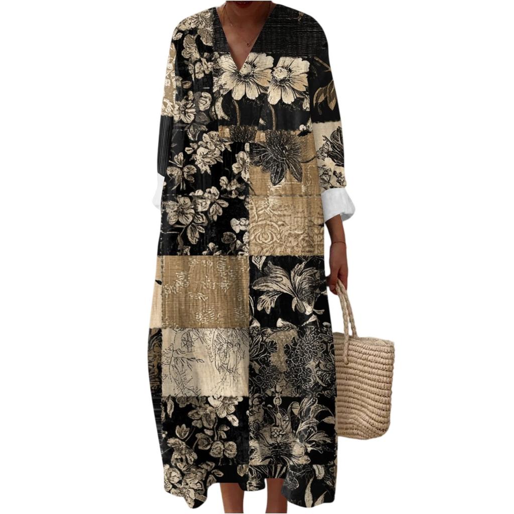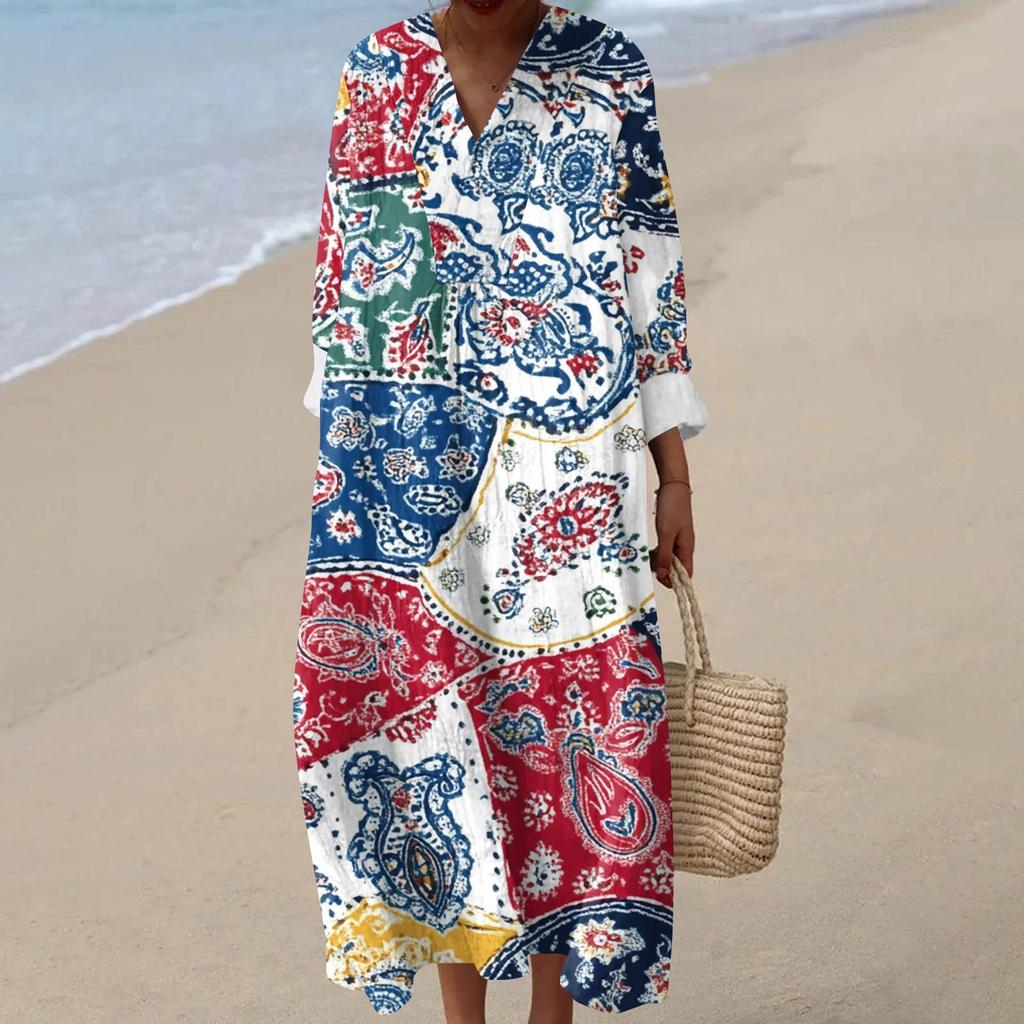Женское повседневное модное платье макси с V-образным вырезом и длинными рукавами с цветочным принтом