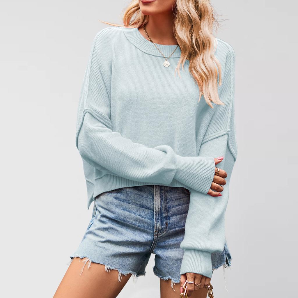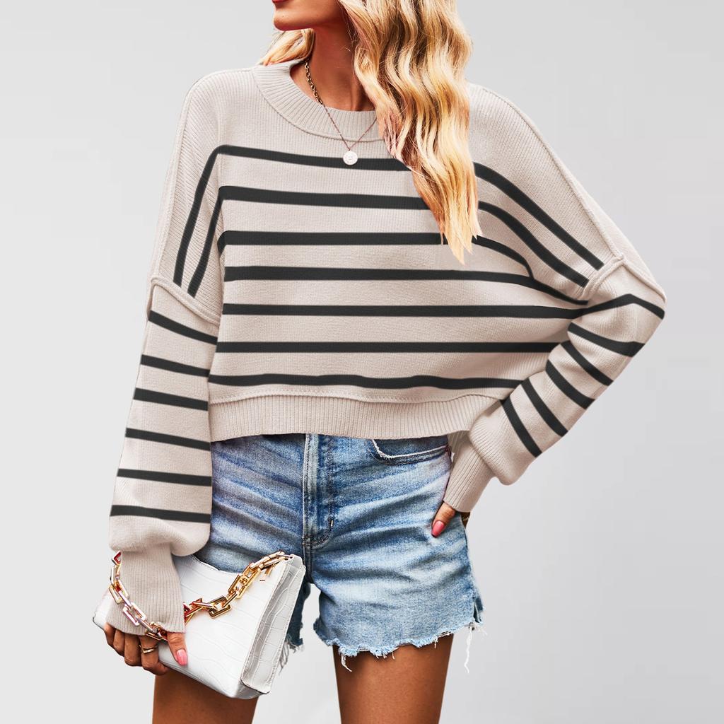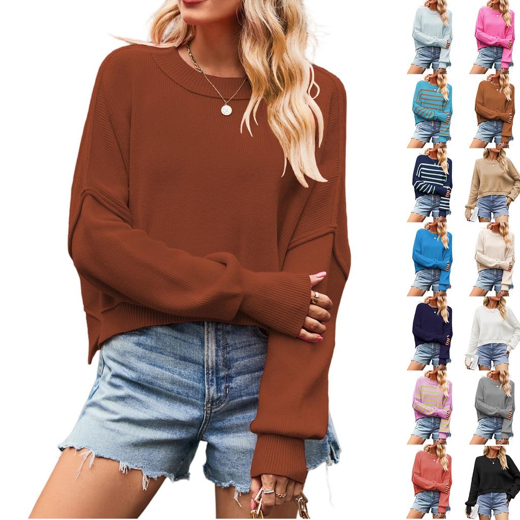 Женский однотонный полосатый модный трикотаж с круглым вырезом, свободный пуловер-свитер