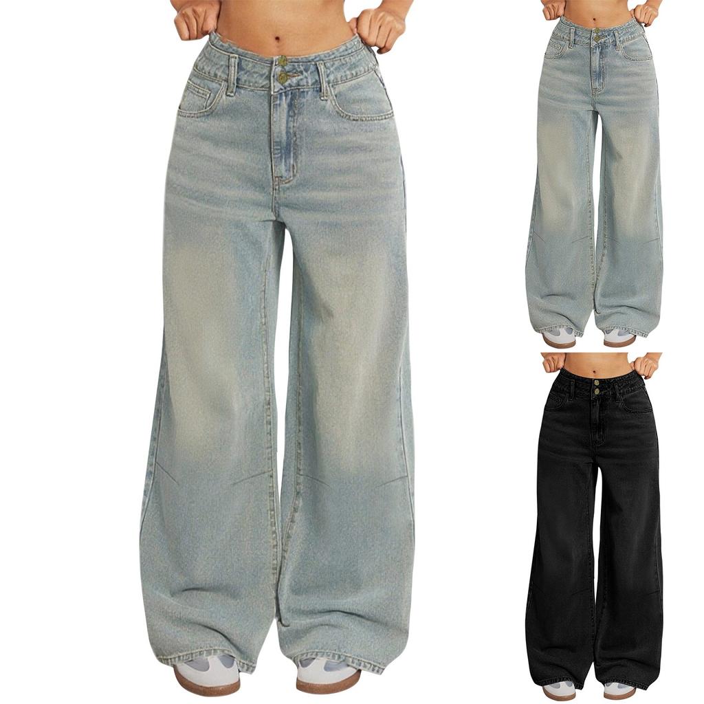 Женские джинсы винтажного дизайна с высокой талией и потертостями на пуговицах, женские свободные прямые широкие брюки