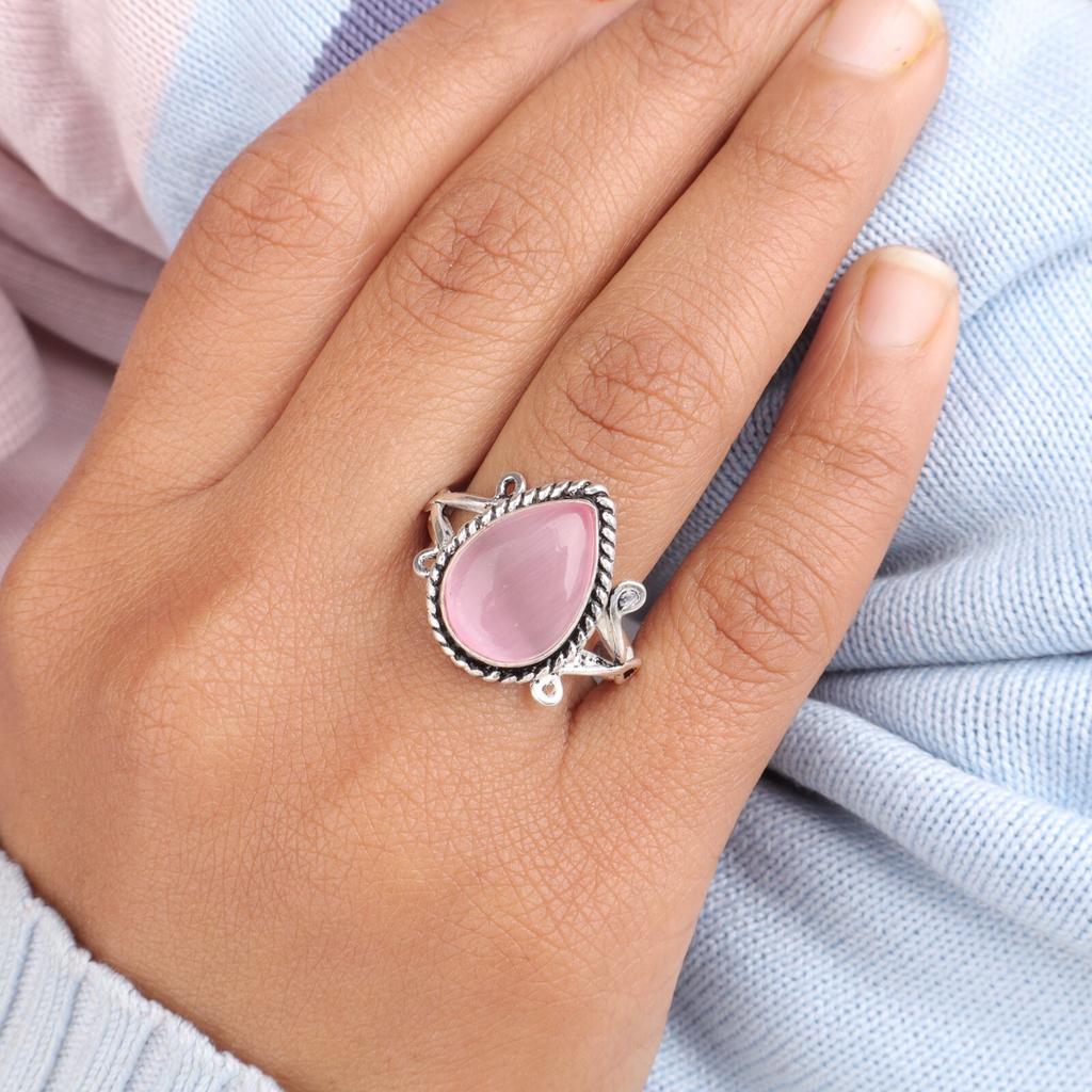 Розовый камень Кошачий глаз 925 Стерлинговое серебро Ювелирное изделие Ручной работы Кольцо Подарок на день рождения RR-57-39