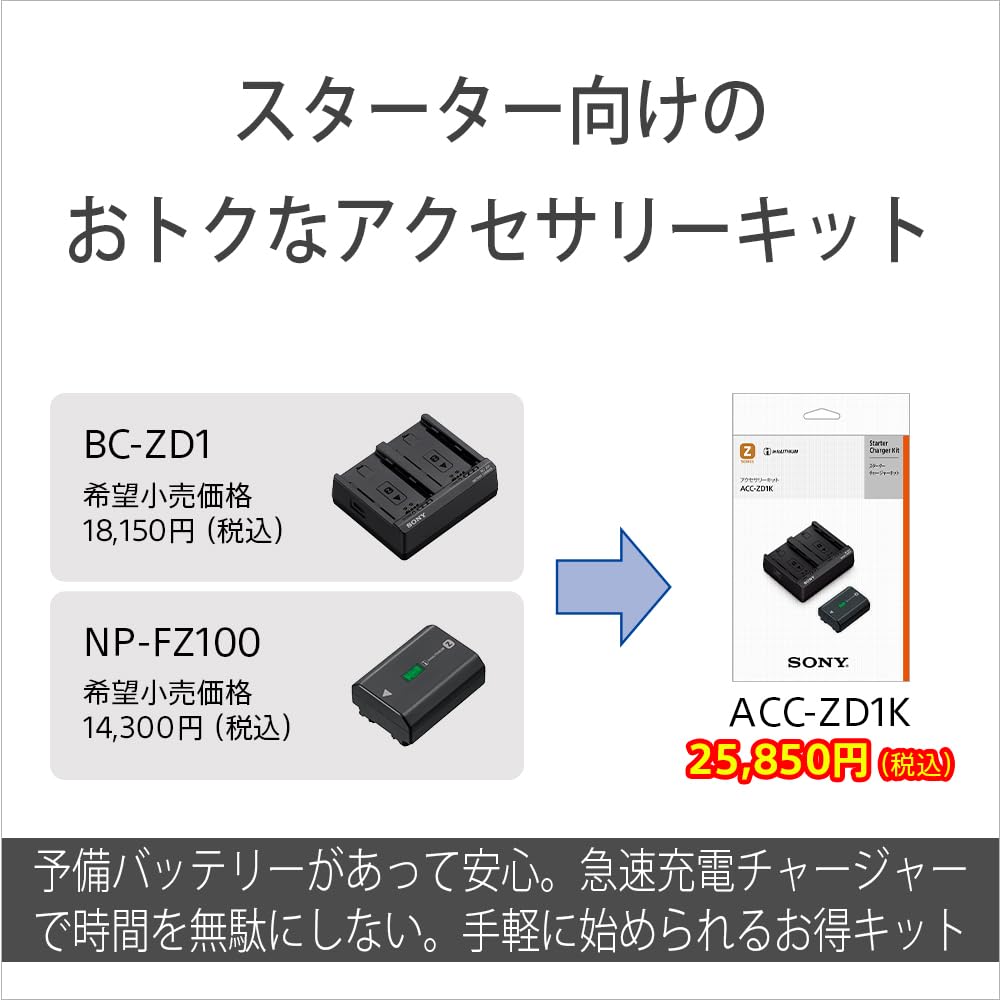 Этот стартовый комплект зарядного устройства для BC-ZD1 и NP-FZ100 поставляется с набором удобных аксессуаров для фотографии.