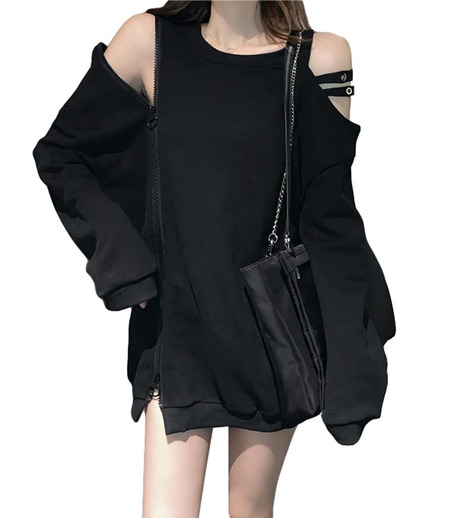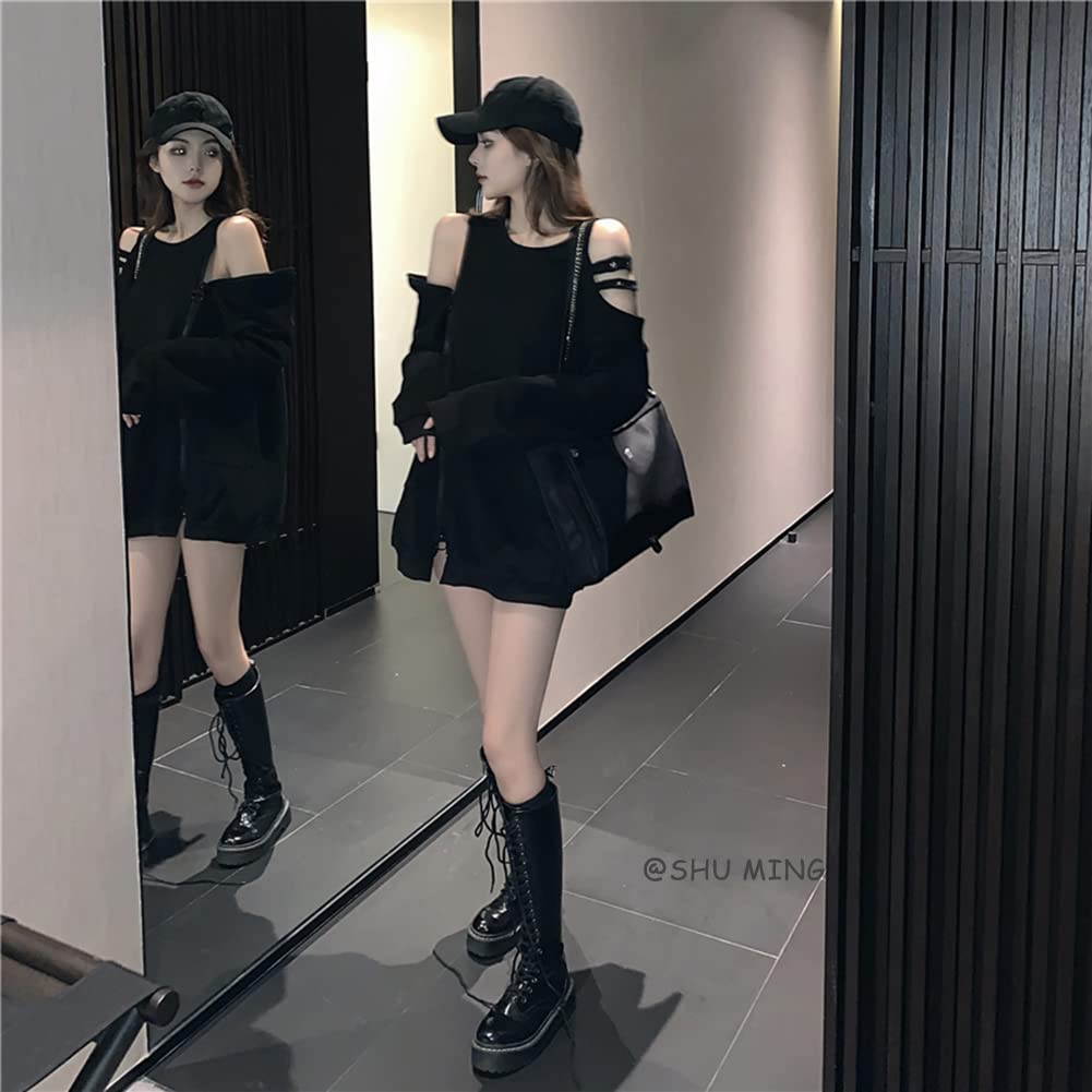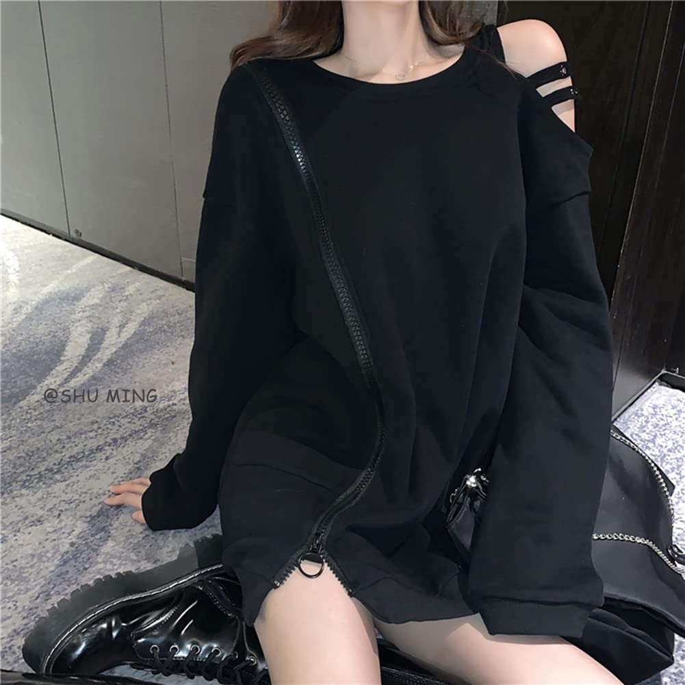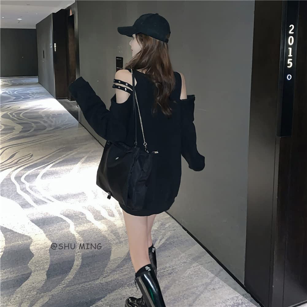 Худи женское ShuMing с длинным рукавом, свободное, уличное, корейское, пуловер, с открытыми плечами, облегающее, простое, черное, стильное, стильное, (Свободный размер, черный)