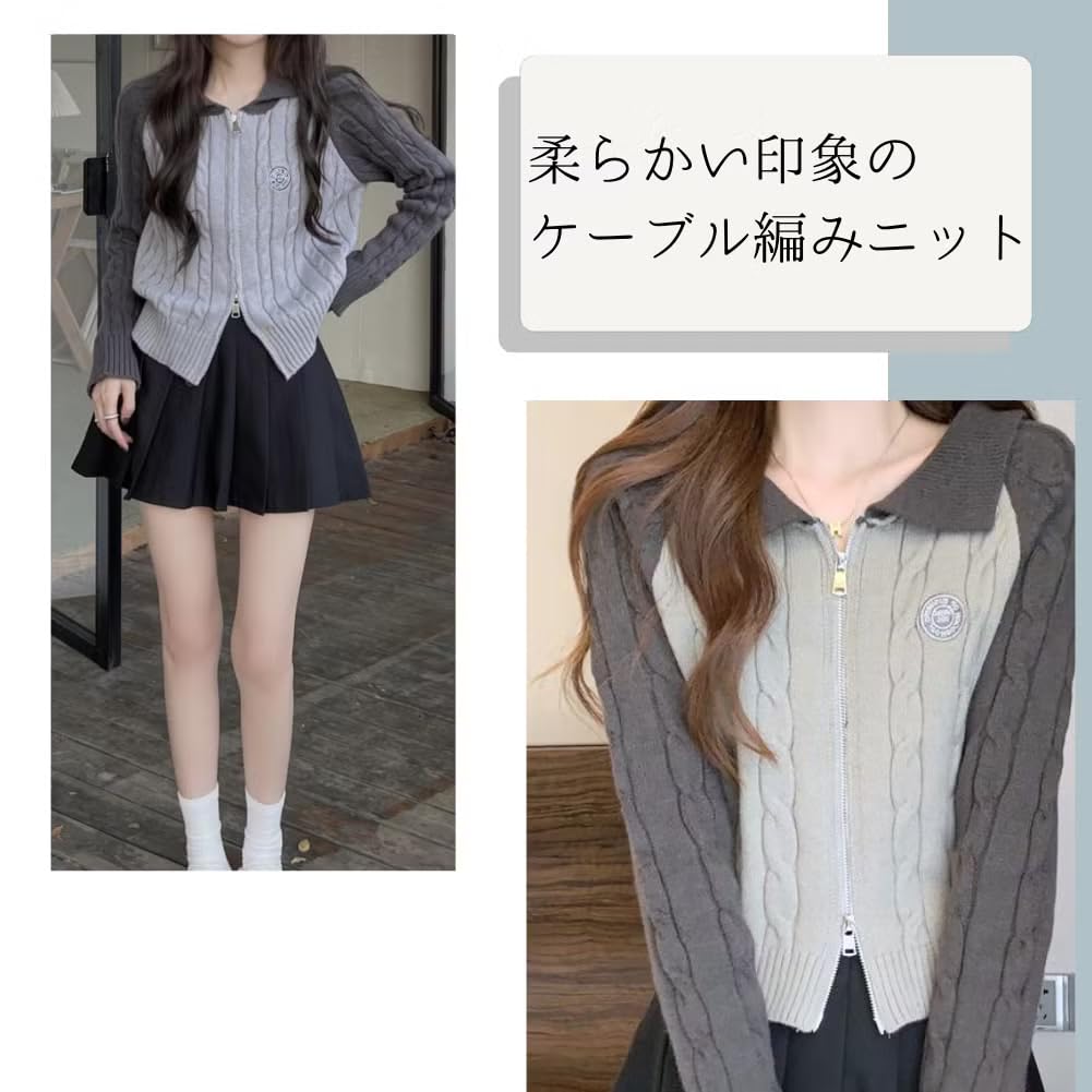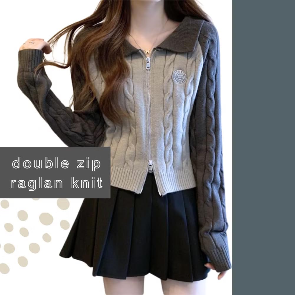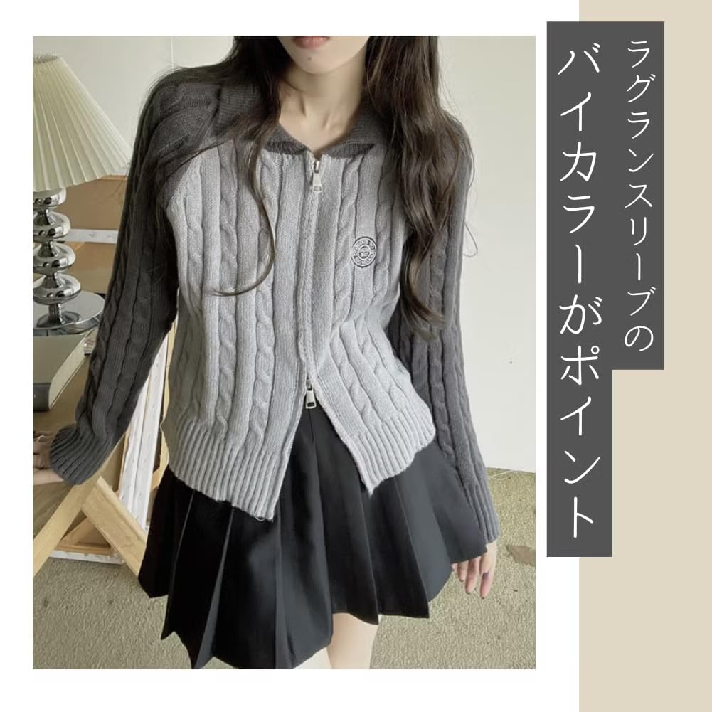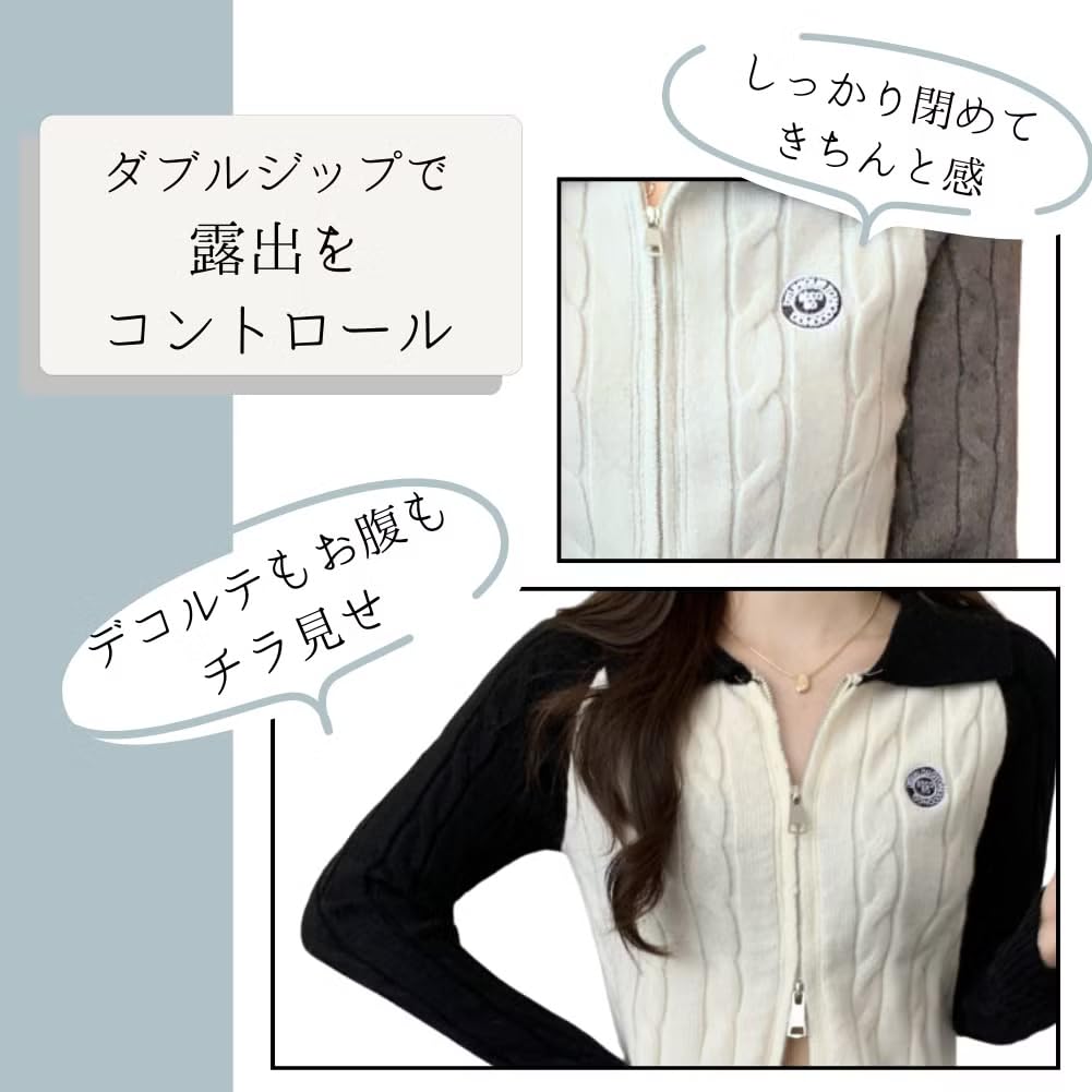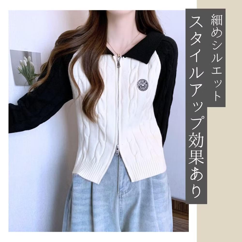 ALVEIN Raglan Sleeve Cable Knit Short Slim Korean Sweater Women's Zip-Through Double-Zip Cardigan, Length, Fit, Style, Midriff-Baring (White)