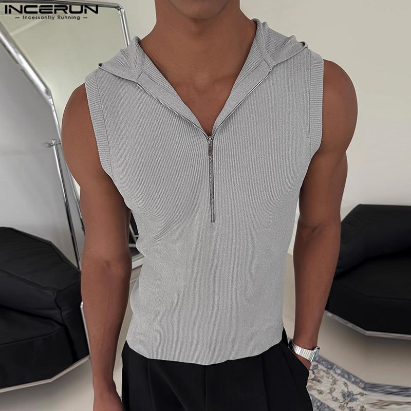 INCERUN Мужские безрукавные повседневные худи-майки в рубчик на молнии