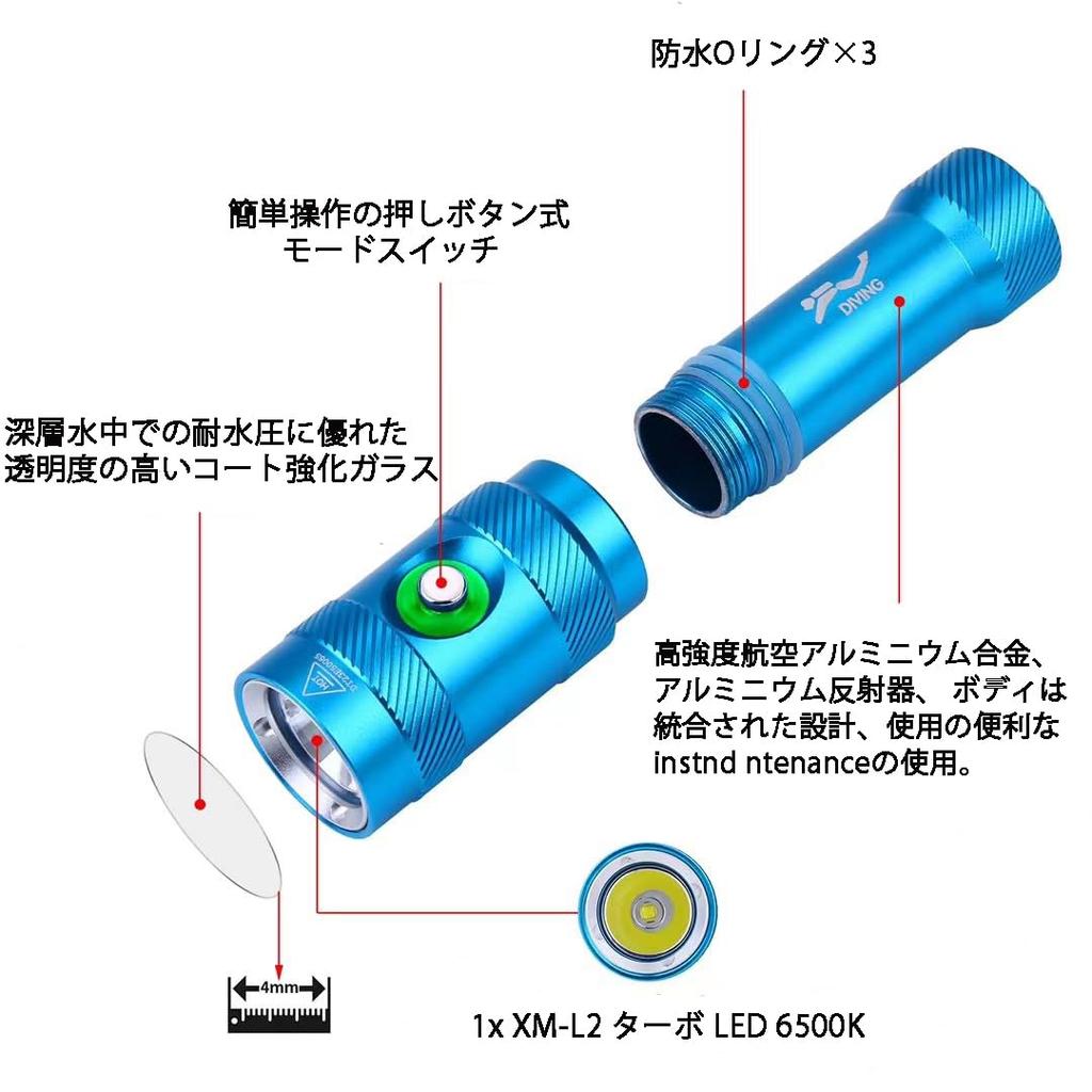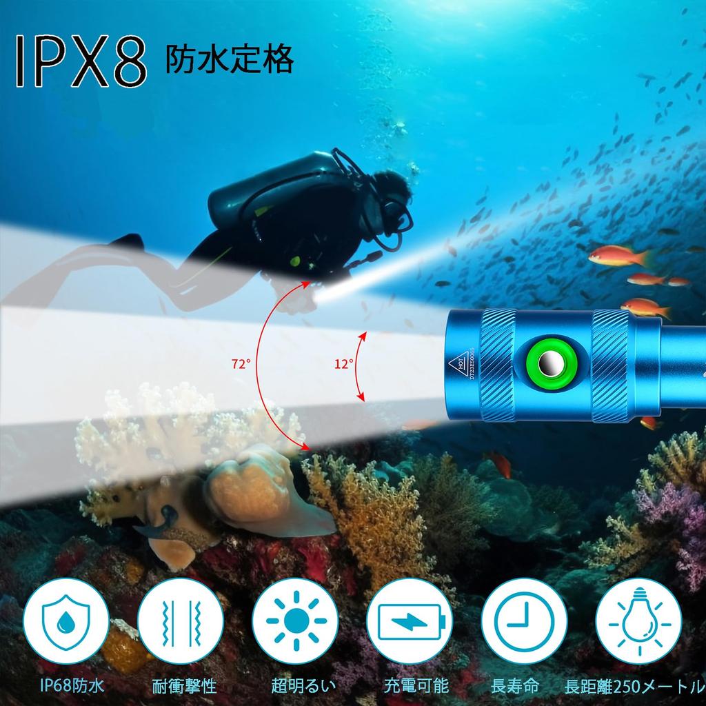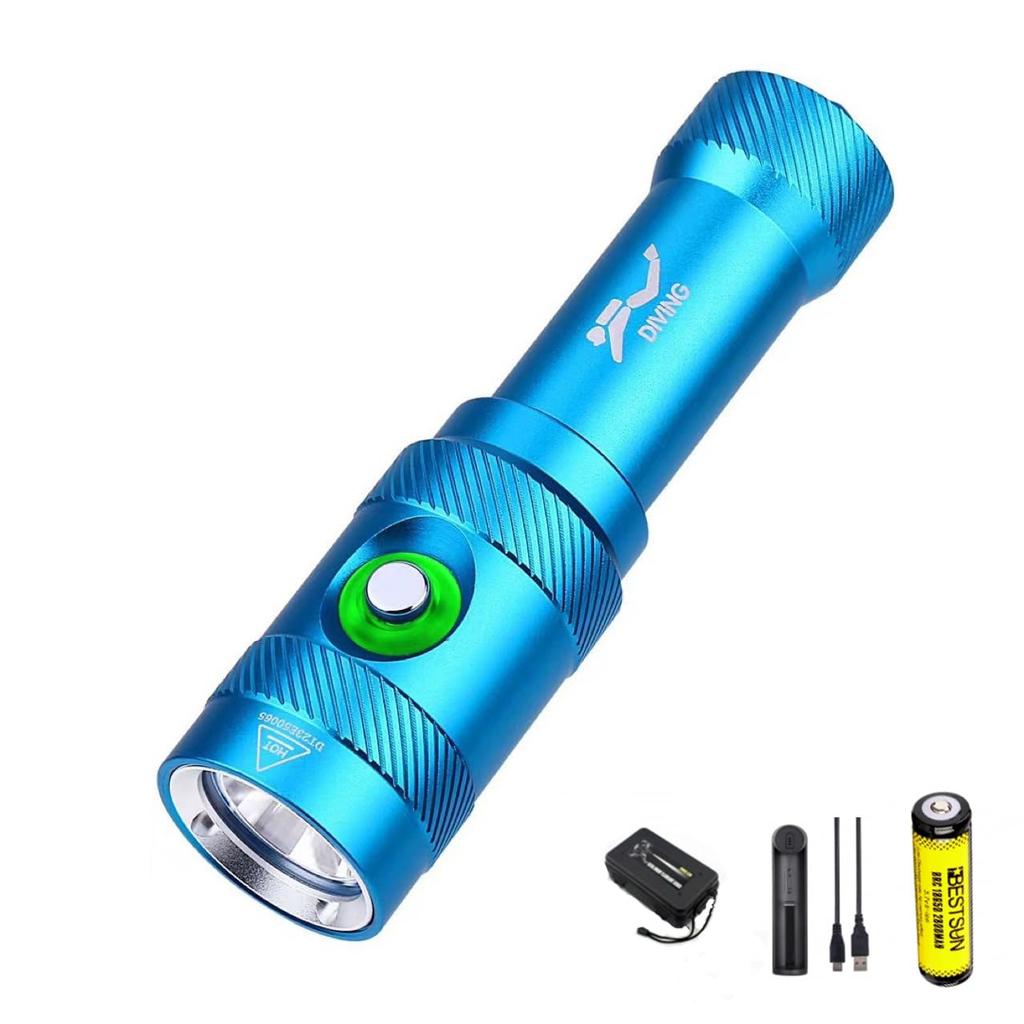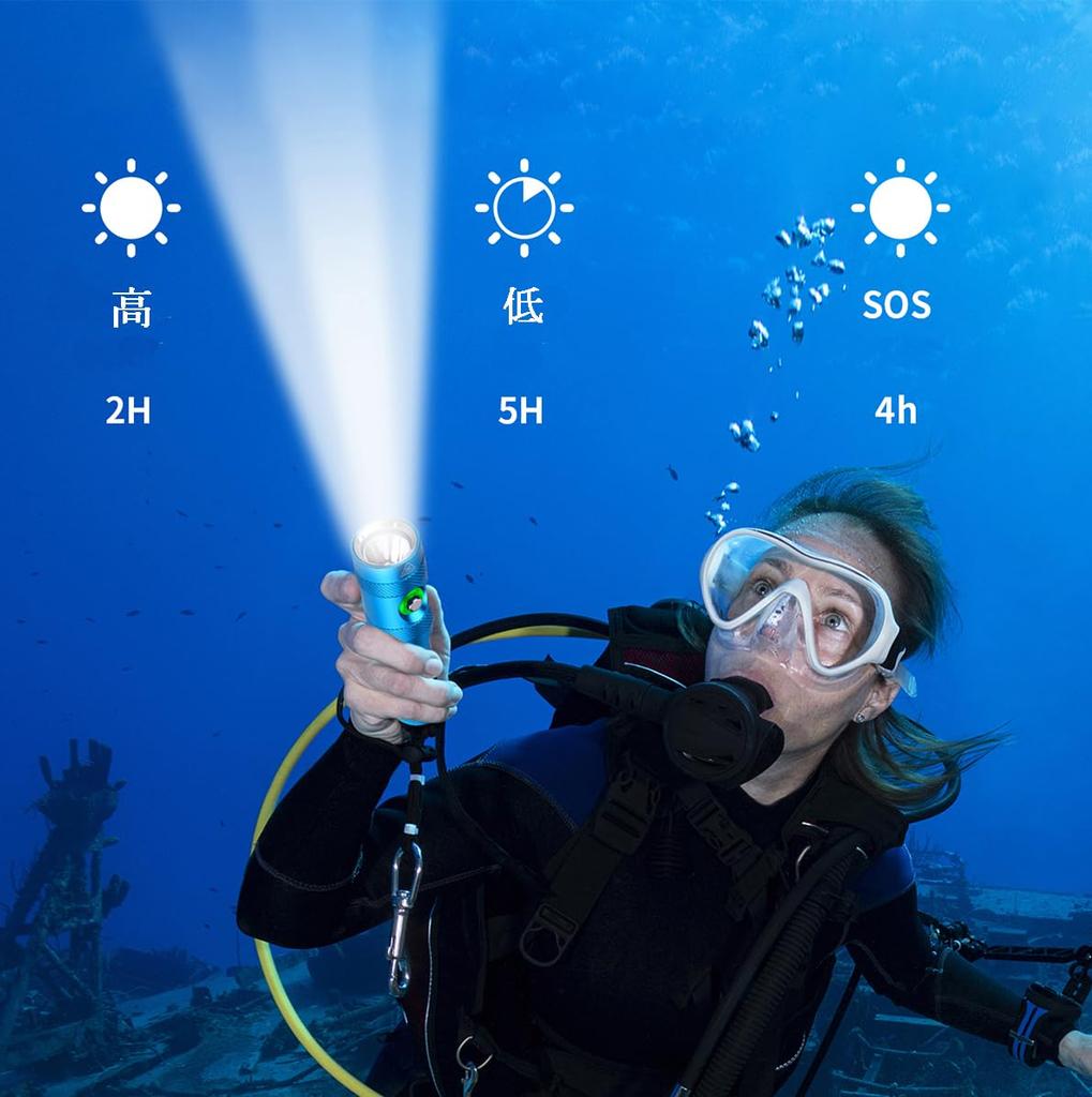 "Сверхяркий подводный фонарь 5000 люмен" Подводный фонарь оснащен одним светодиодом XM-L2 и обеспечивает чрезвычайно яркий холодный белый свет с максимальной мощностью 5000 люмен. У него есть мощный свет, который горит 3,5 часа, тусклый свет, который можно использовать непрерывно в течение 6 часов, и режим SOS, который можно использовать непрерывно в течение 5 часов.