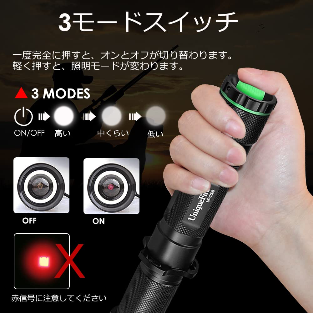 [3 режима] Фонарик имеет три режима: высокий, средний и низкий, и имеет функцию памяти режима. Сильно нажмите хвостовой переключатель до щелчка (полностью нажмите) , чтобы включить его. Нажмите его еще раз, чтобы выключить. Когда он включен, слегка нажмите хвостовую кнопку, чтобы переключиться между тремя режимами. У него есть память режима, поэтому он запомнит последнюю использованную вами настройку.