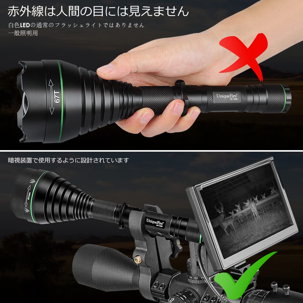 [Инфракрасный светодиодный свет] Фонарик UniqueFire 1508 T50 850 нм не является типичным светодиодным фонариком с белым светом. В нем используется инфракрасный светодиод Osram black 850 нм для излучения мощного ИК-света, невидимого невооруженным глазом человека и животных, мощностью примерно 5 Вт. (светодиод Osram имеет небольшое красное свечение, указывающее на то, что свет включен). Его можно использовать в качестве дополнения к приборам ночного видения, но обратите внимание, что не все инфракрасные камеры и прицелы ночного видения могут улавливать ИК-свет 940 нм.. Свет 850 нм сильнее и более заметен. Это потому, что свет 940 нм находится гораздо дальше от спектра видимого света, чем 850 нм, что затрудняет его фиксацию датчиками камеры.. Пожалуйста, убедитесь в совместимости вашего фотооборудования перед покупкой.