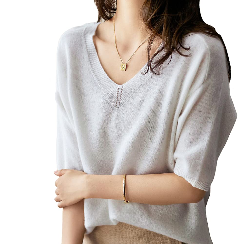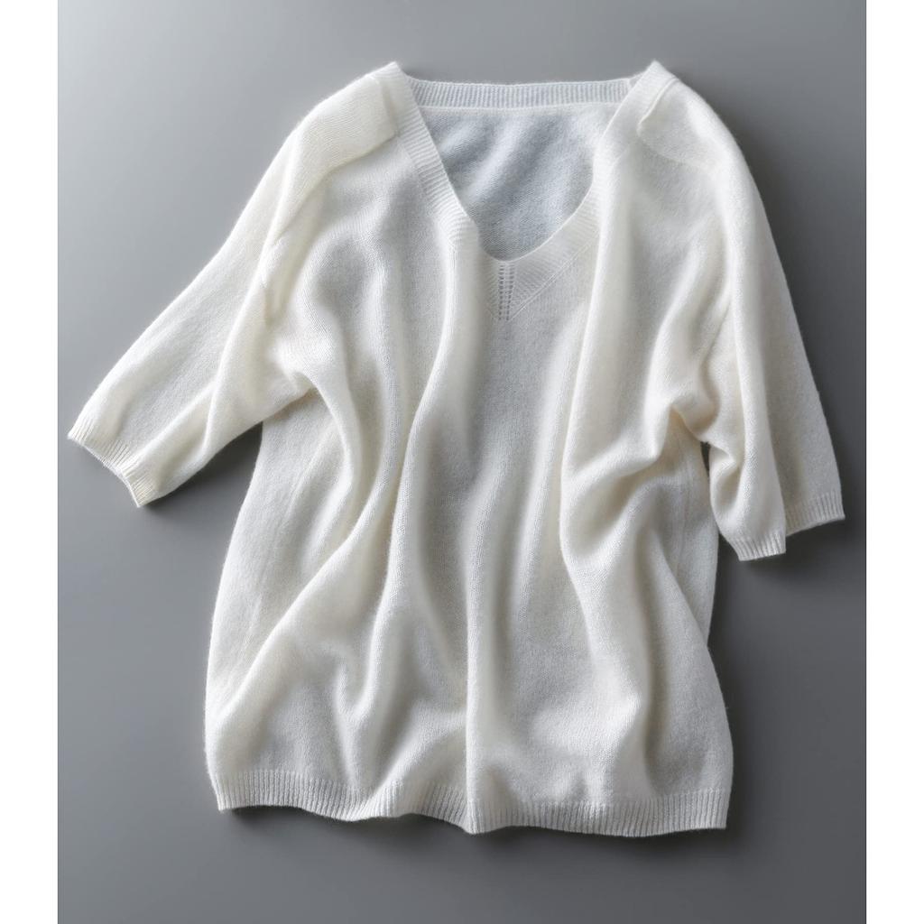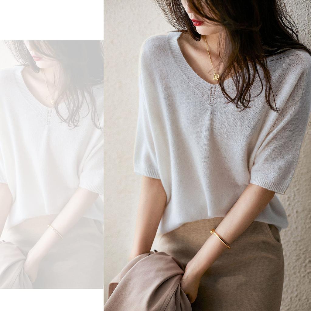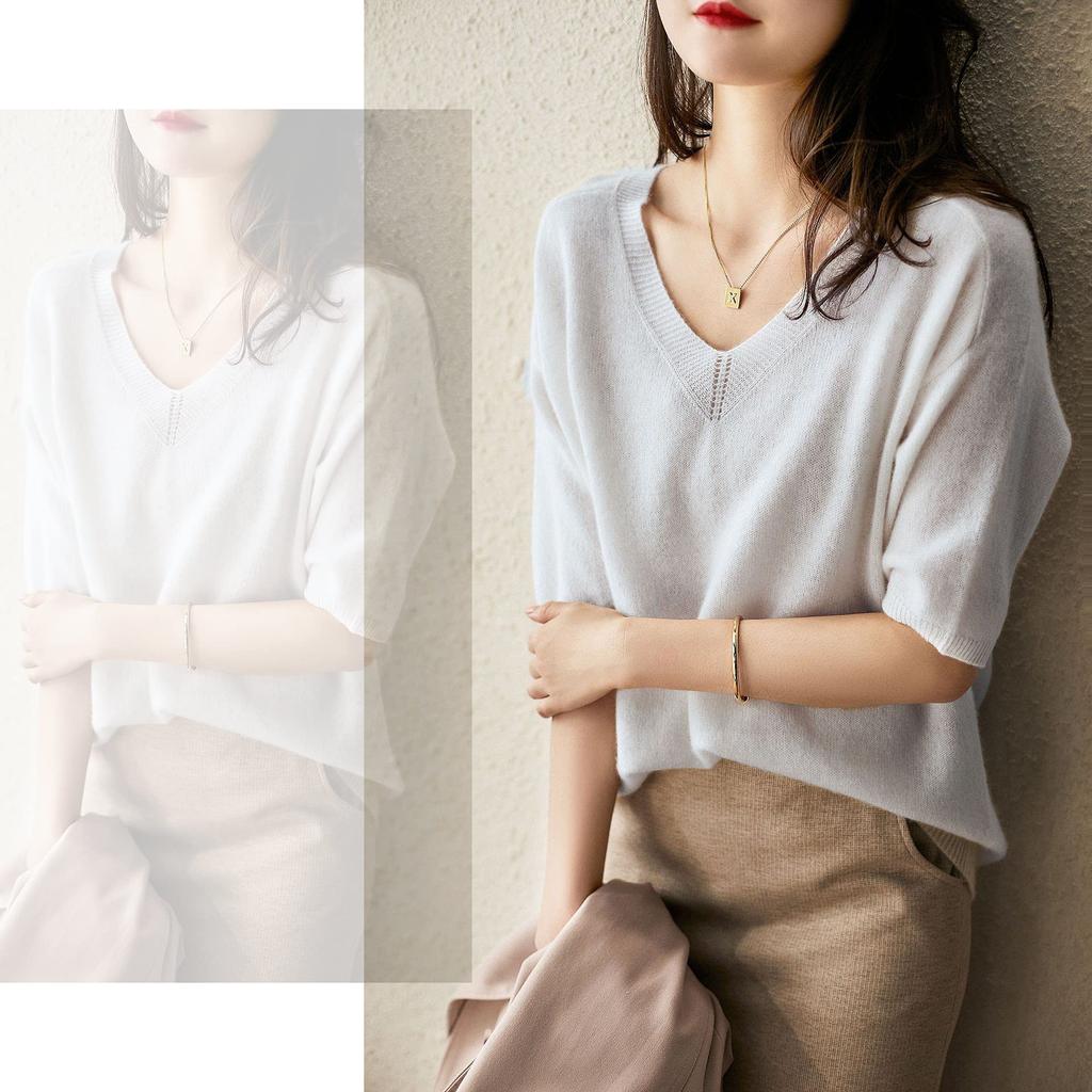 Летний крой и вязка 2XL [Bolan Verl] вязаный, сшитый, V-образный вырез, рукав 5/8, топ, чистый, простой, однотонный, весна, лето, осень, женский, свободный, прозрачный, белый,