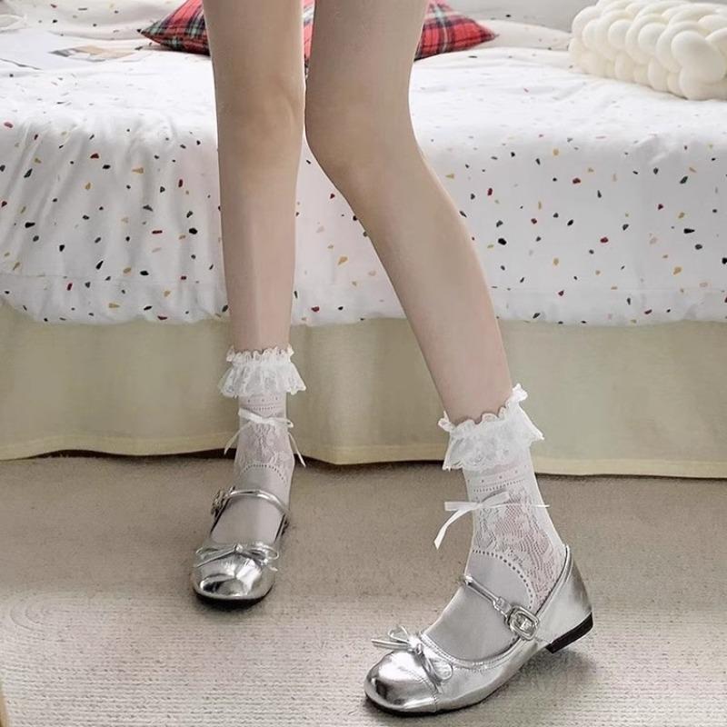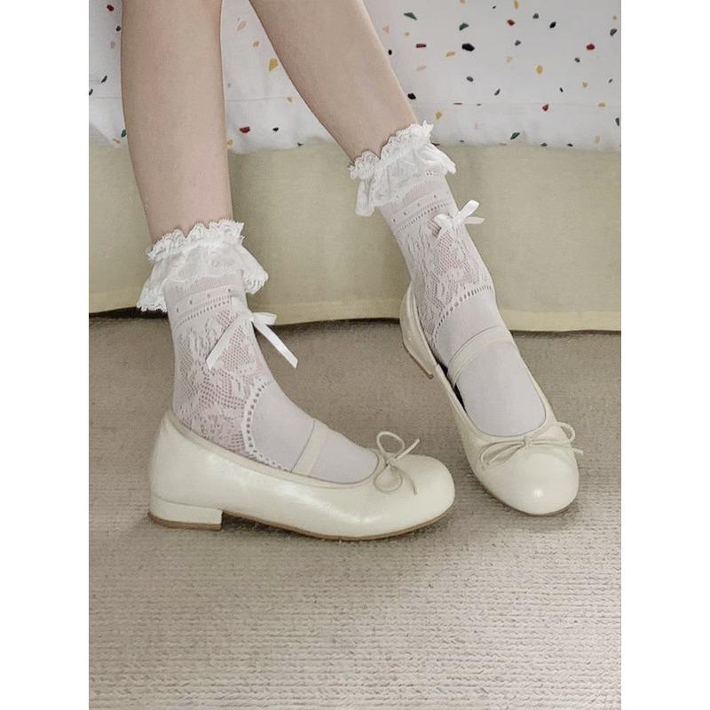 Женские весенне-летние тонкие милые носки-гольфы в стиле балеток с бантом и кружевом