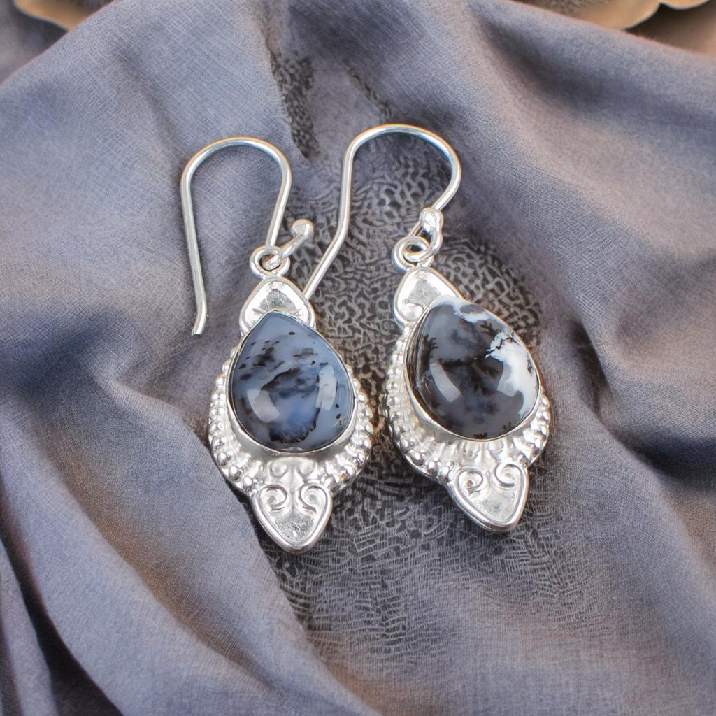 Natural Dendritic Opal Gemstone 925 Solid Silver Jewelry Handmade Earrings 1.80" EE-42-21
