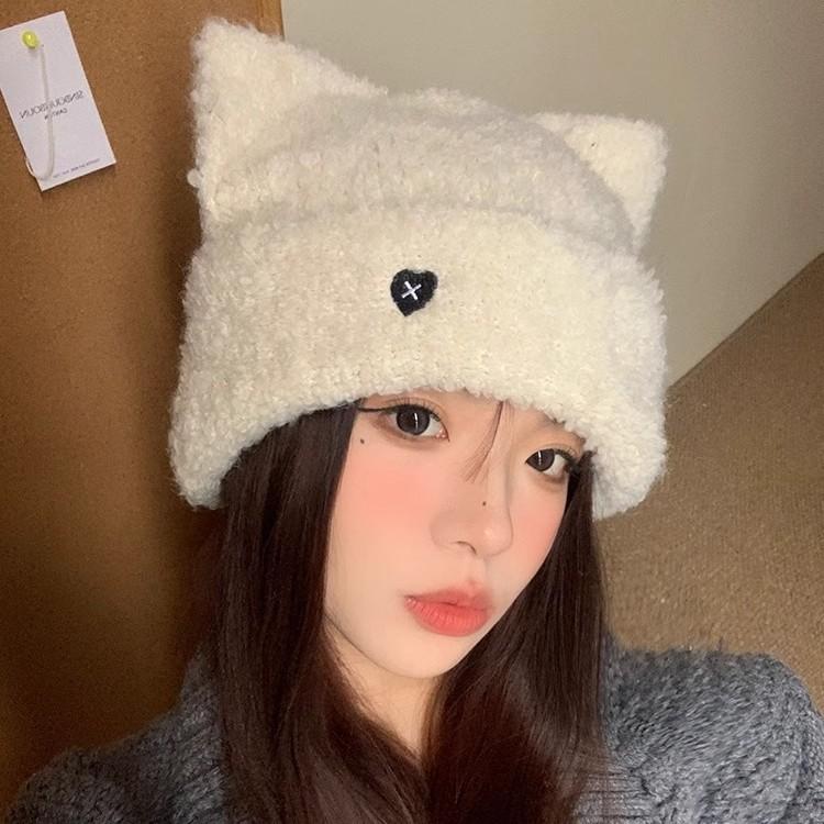 Шапки для женщин Вязаная милая шапка с кошачьими ушками Вязаная шерстяная шапка с вышивкой Love Зимняя теплая шапка для защиты ушей от холода