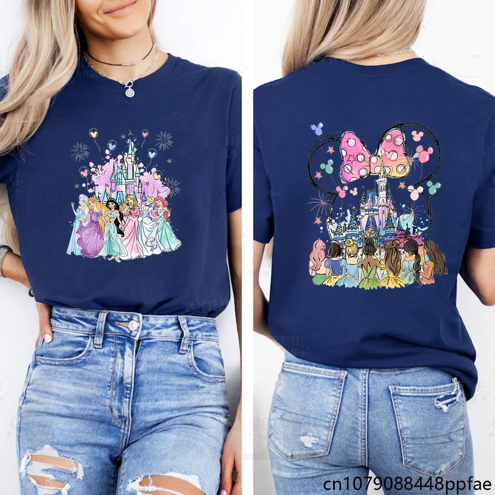 Женская мода Новая милая футболка с принтом принцессы Диснея Рубашка с замком Диснея Милая футболка с головой Минни