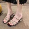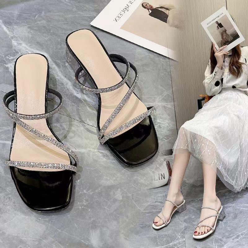 Крутые тапочки на высоком каблуке, женские, лето 2025, новая корейская версия, модные феи, стразы, средний каблук, модные тапочки
