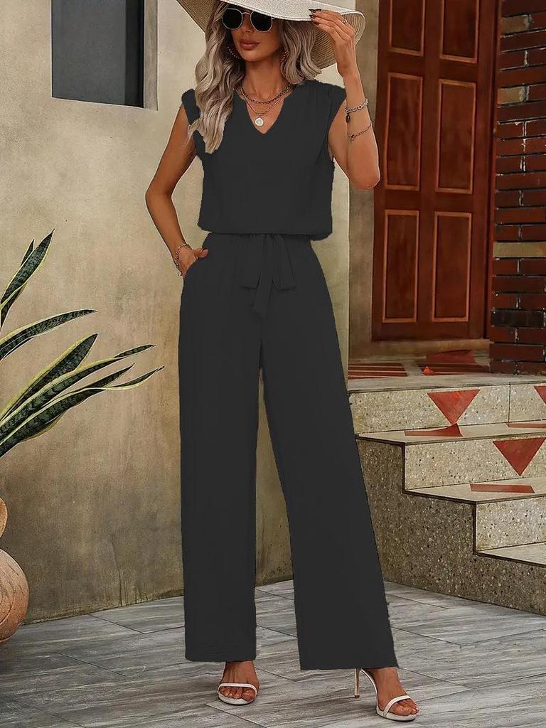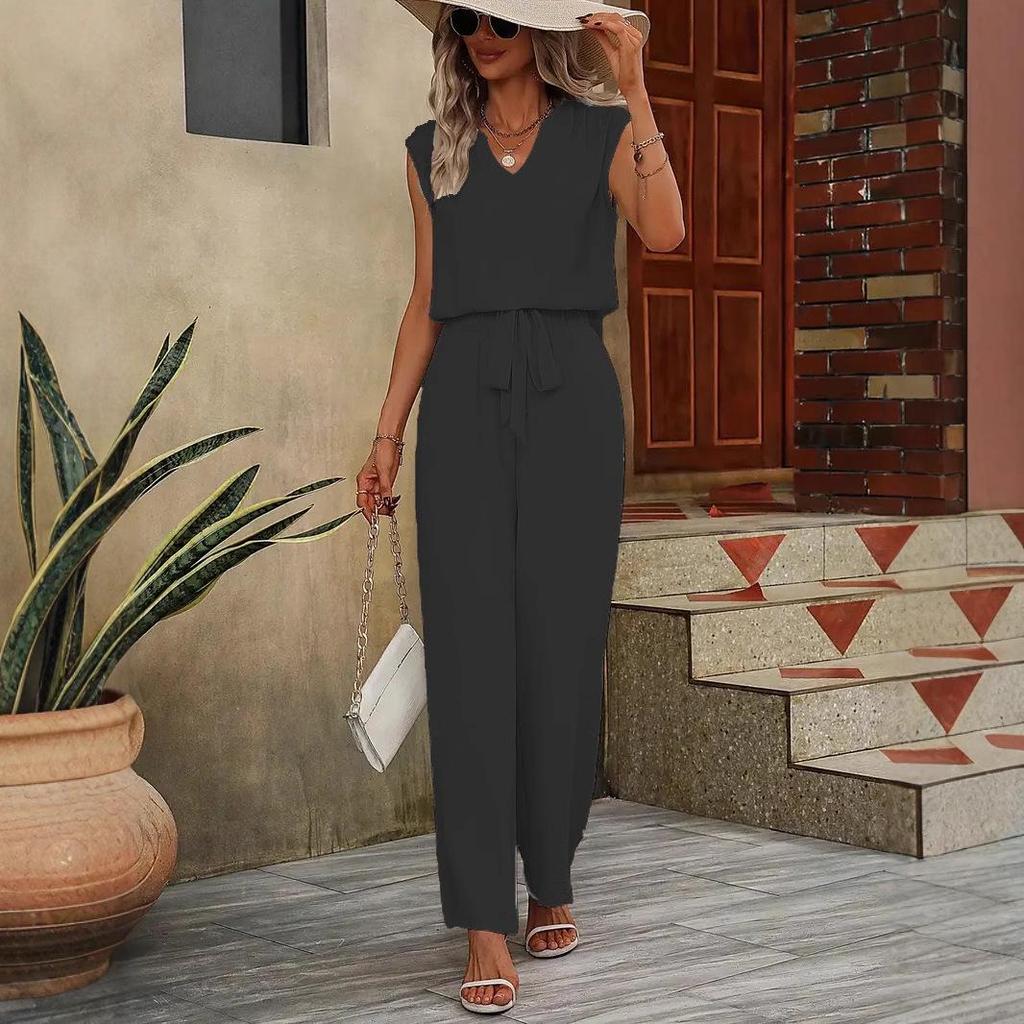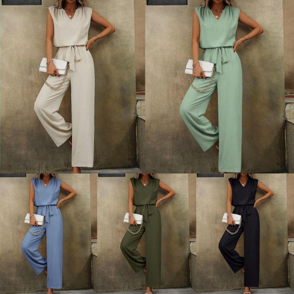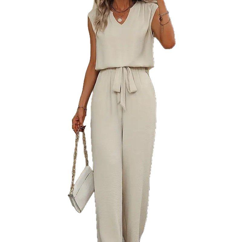 Оцените непринужденный стиль с этим комплектом из топа без рукавов с V-образным вырезом и широких брюк на кулиске, идеальным для лета 2025.. Этот повседневный комплект с однотонным узором изготовлен из удобного полиэстера, обеспечивающего легкую и дышащую посадку.. Универсальный дизайн делает его идеальным для всего, от расслабленных дней дома до повседневных прогулок.