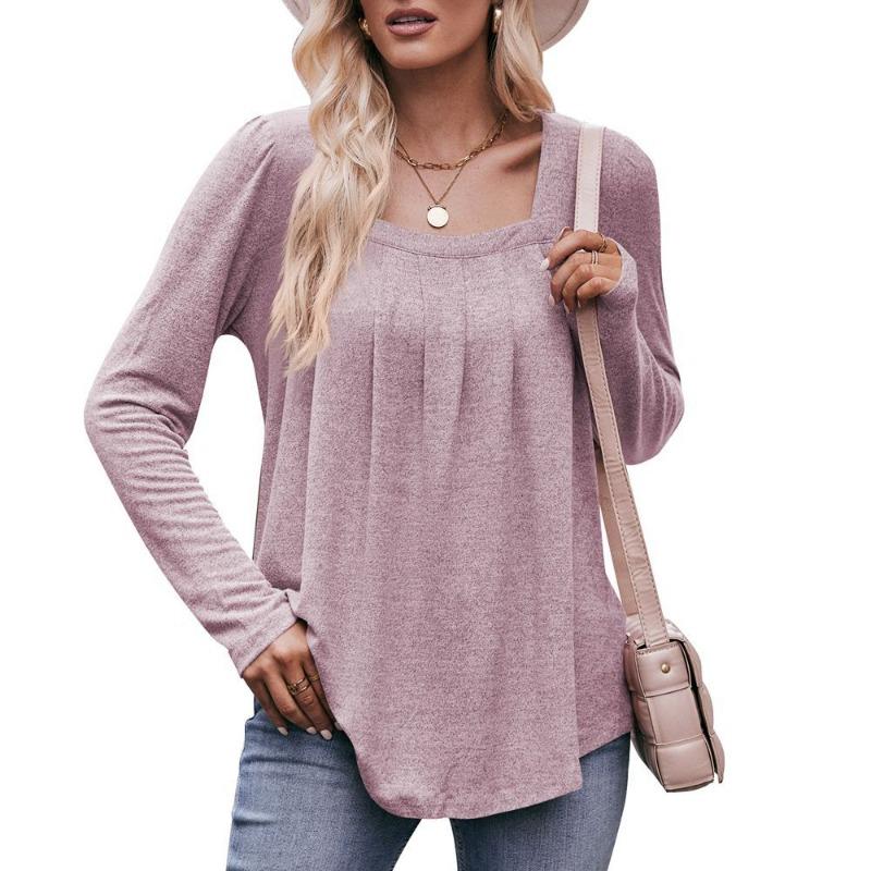 Женская осенне-зимняя футболка в новом стиле, повседневная, с пышными рукавами, квадратным вырезом, плиссированная, с длинными рукавами, пуловер