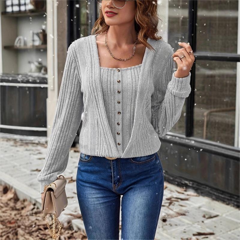 Женская весенне-осенняя новая футболка, повседневная модная трикотажная кофта свободного кроя с длинным рукавом на пуговицах, однотонная