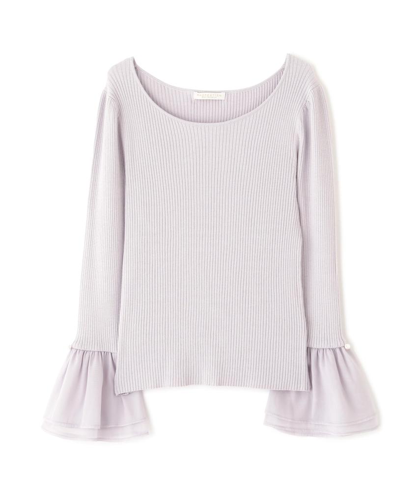 This comfortable ribbed knit top features a clean, open décolleté and bold flared sleeves. The flared sleeves are made of a slightly shiny sheer material, adding a touch of glamour to your hands. It can be paired with dressy pants or casual denim pants, and you can also enjoy layering it with a jumper skirt.