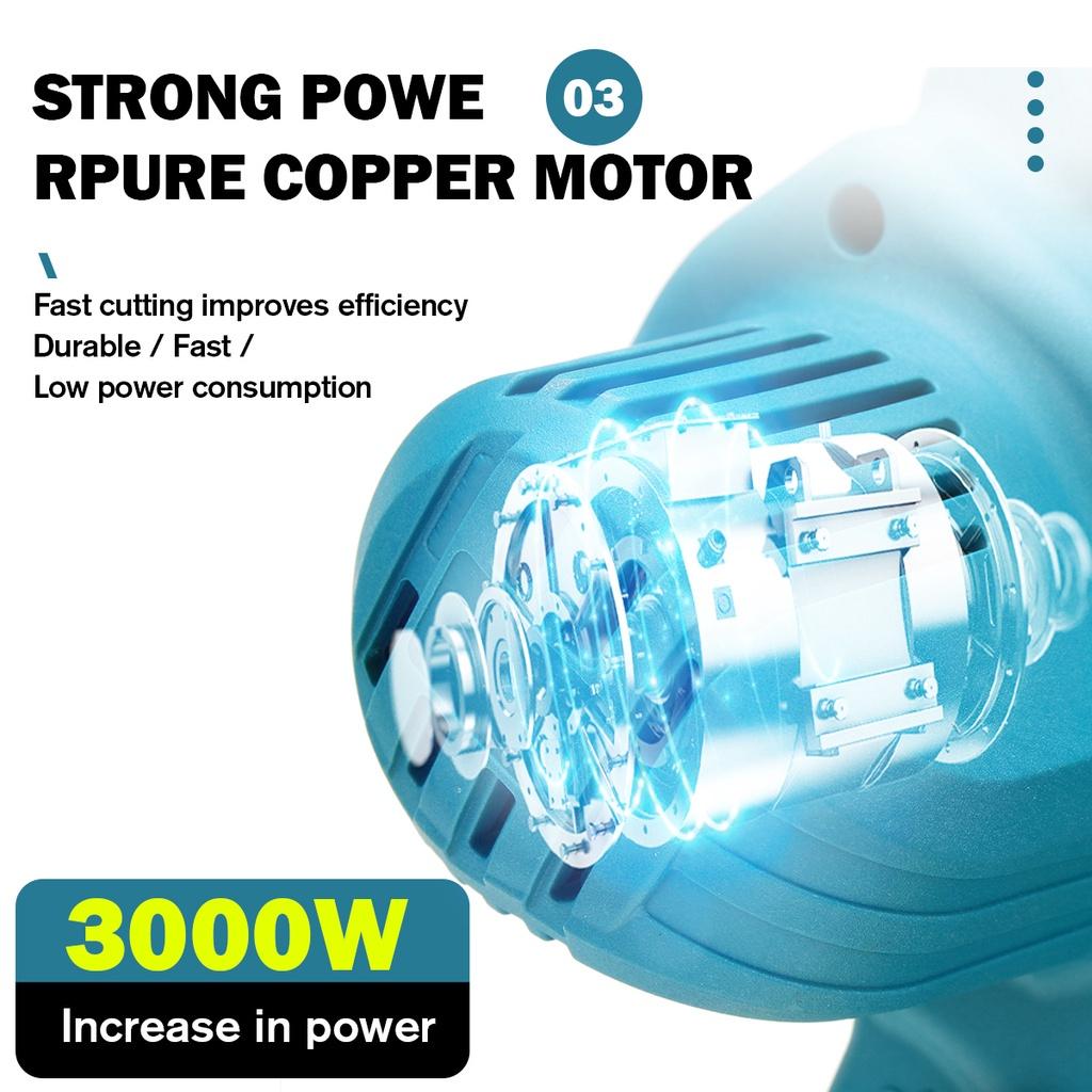 - Бесщеточный медный двигатель: сильная мощность, более стабильная выходная мощность, чем цепная пила, модифицированная угловой шлифовальной машиной. Высокая нагрузка настолько, что нельзя легко сжечь.