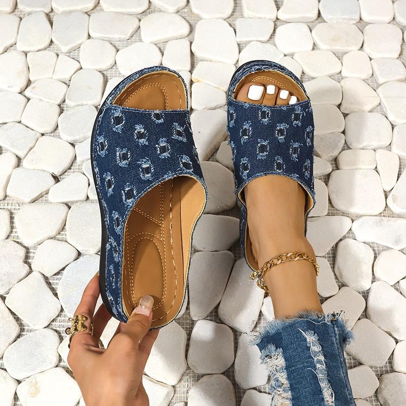Большого размера шлепанцы на танкетке женские летние новые джинсовые шлепанцы на толстой подошве