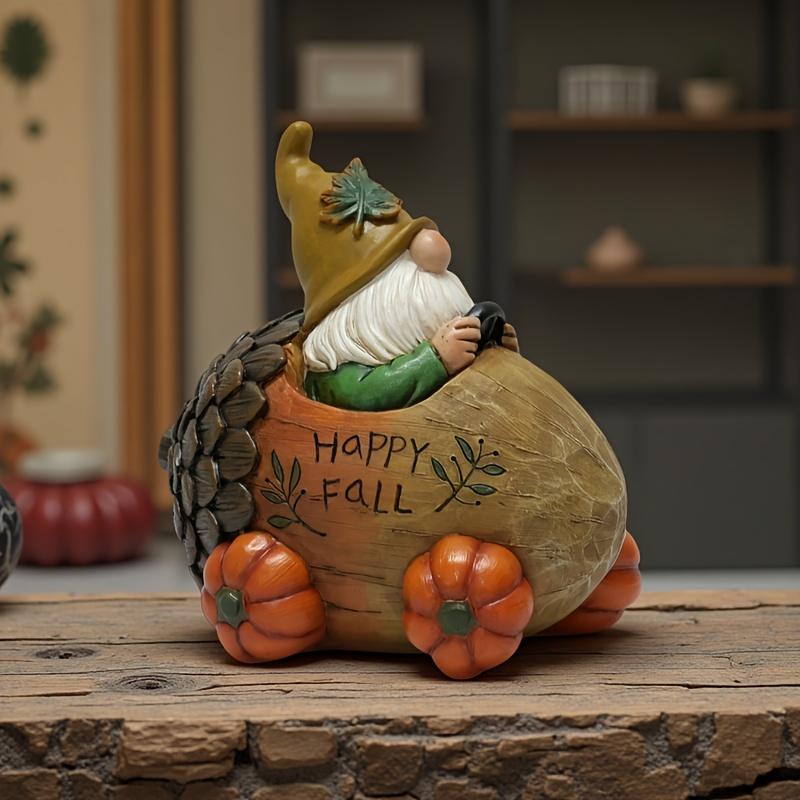 1 шт. Статуэтка садового гнома «Осенний урожай», тележка из сосновых шишек с колесом-тыквой, декоративное забавное украшение в виде гнома и тележки из сосновых шишек, подходит для двора, газона, крыльца