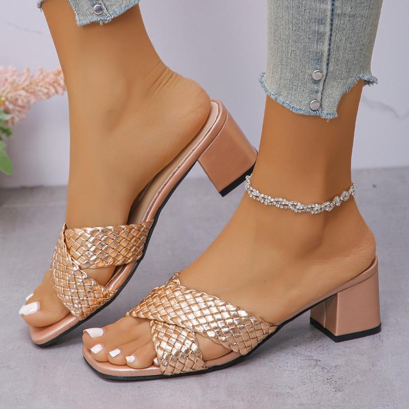 Летние новые однословные плетеные босоножки с перекрестными ремешками на высоком каблуке большого размера на толстом каблуке крутые шлепанцы женские