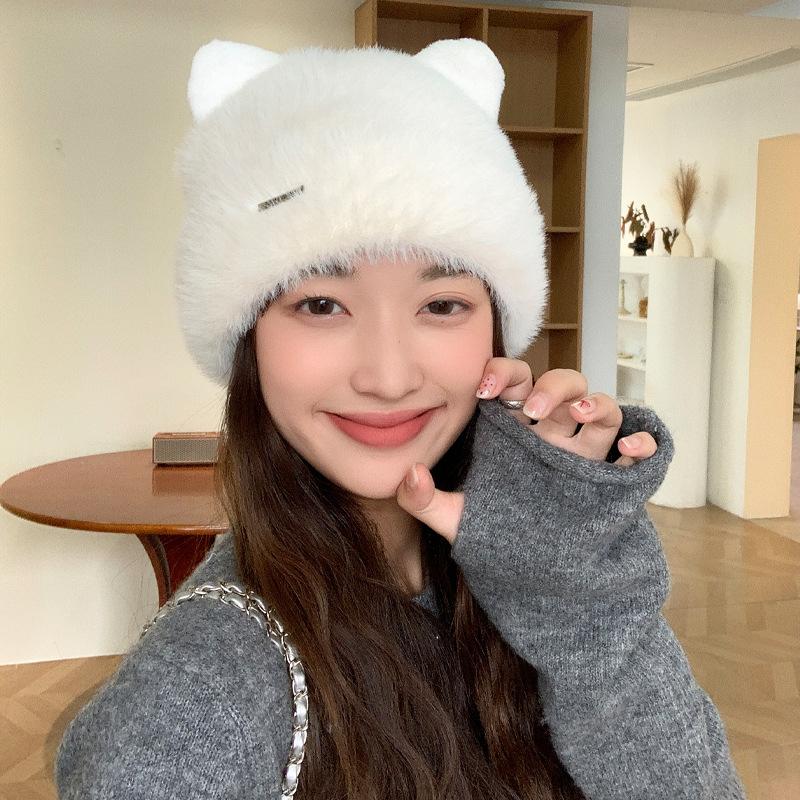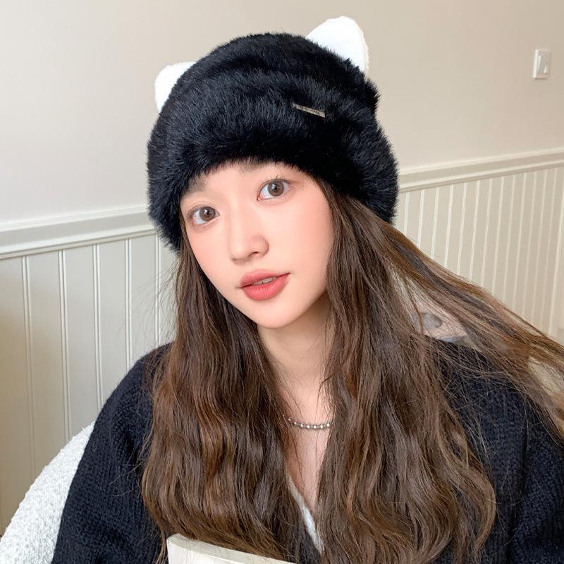 Новая шапка для женщин, имитация норкового меха, милая шапка с ушками, вязаная шерстяная шапка, однотонная, универсальная, студенческая теплая шапка