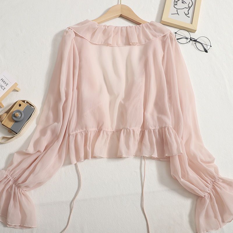 Свободные блузки женские с рюшами V-образный вырез летние тонкие с длинным рукавом милая девушка уличная одежда