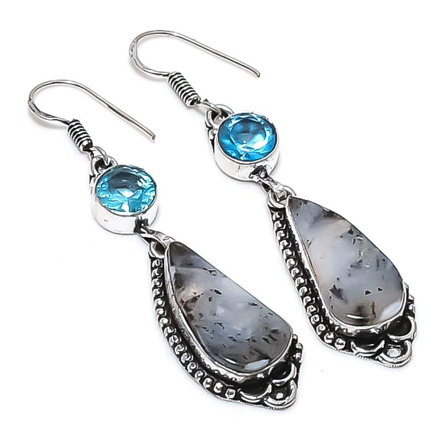 Натуральный дендритовый опал, топаз 925 стерлинговое серебро ювелирные серьги 2,44" g5O85