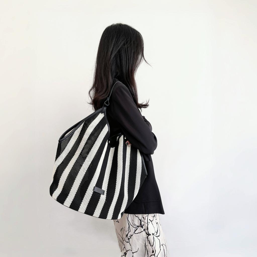 Премиальная женская сумка на плечо большой вместимости из тканого материала в черную и белую полоску, легкая сумка для отдыха в ленивом стиле, сумка для покупок