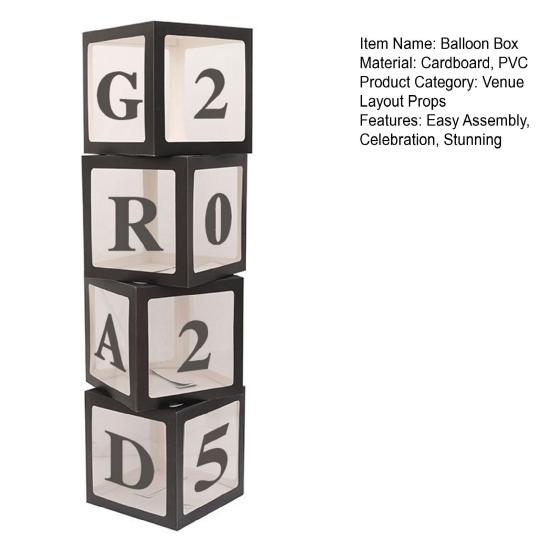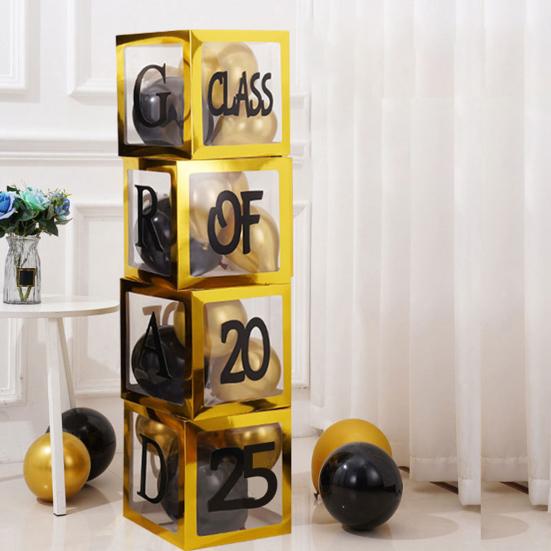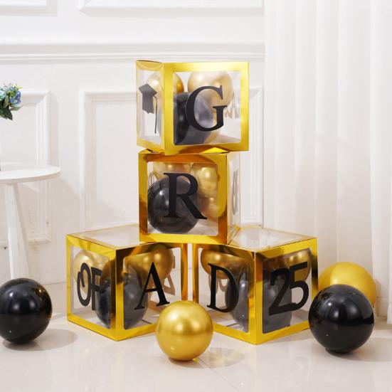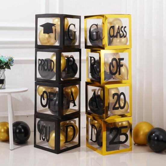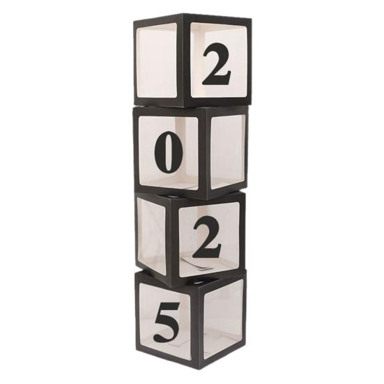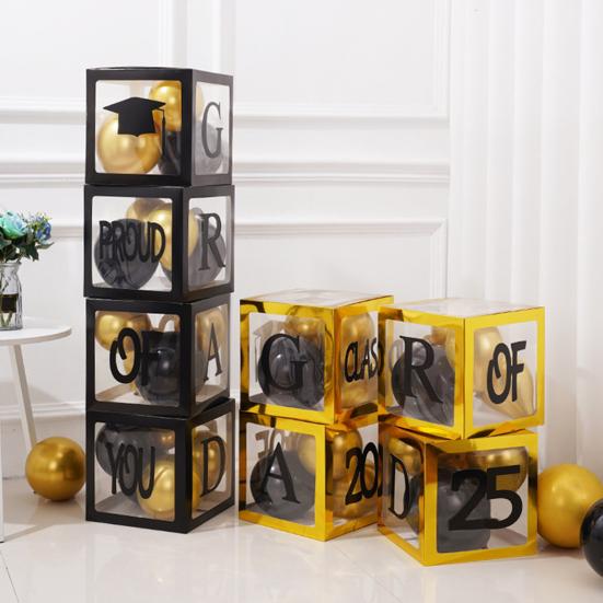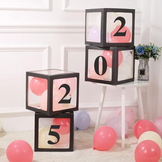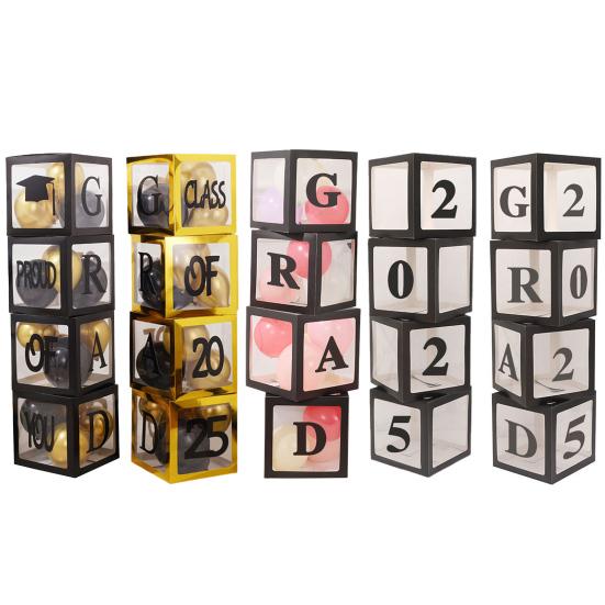 Полный комплект: Включает 4/8 черных коробок с выпускными шарами (11,8 x 11,8 дюйма), буквы и клей. Элегантный дизайн с надписью «2025» идеально подойдет для различных выпускных мероприятий.
