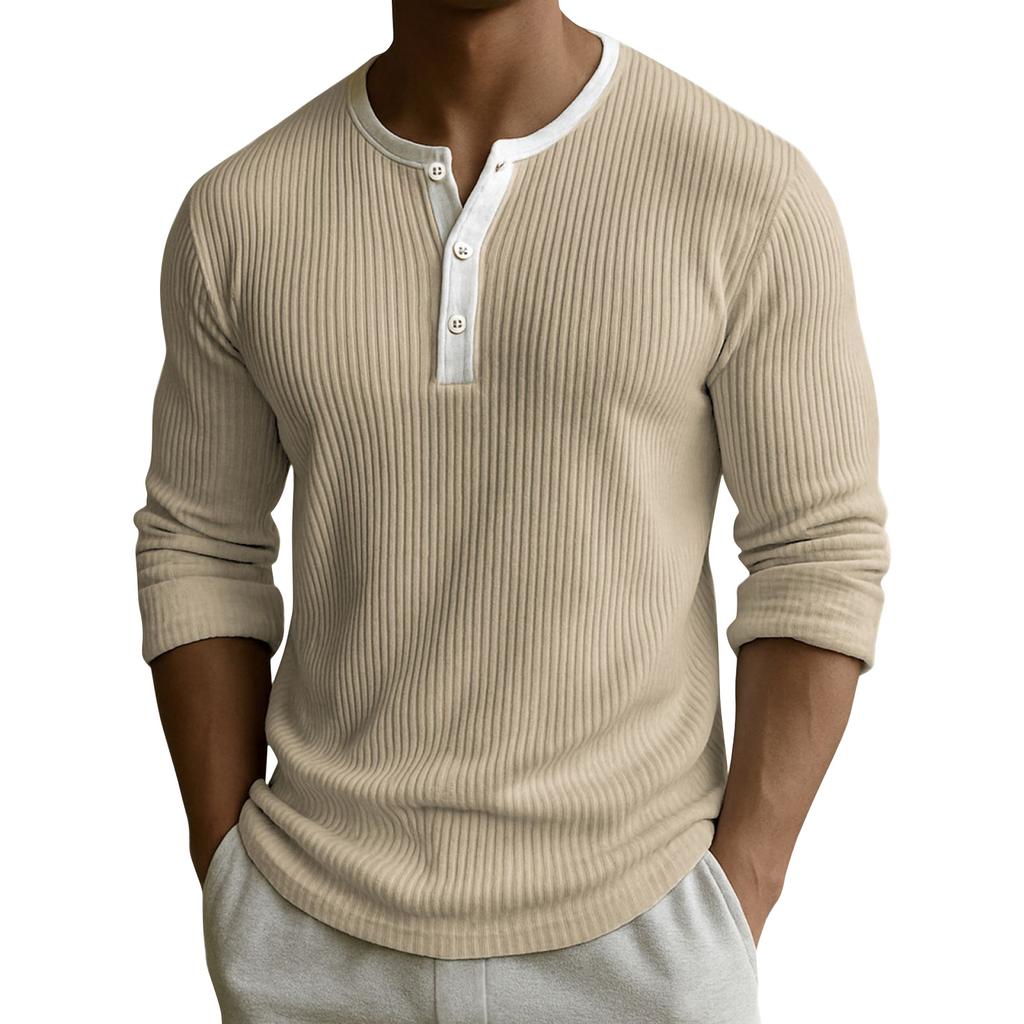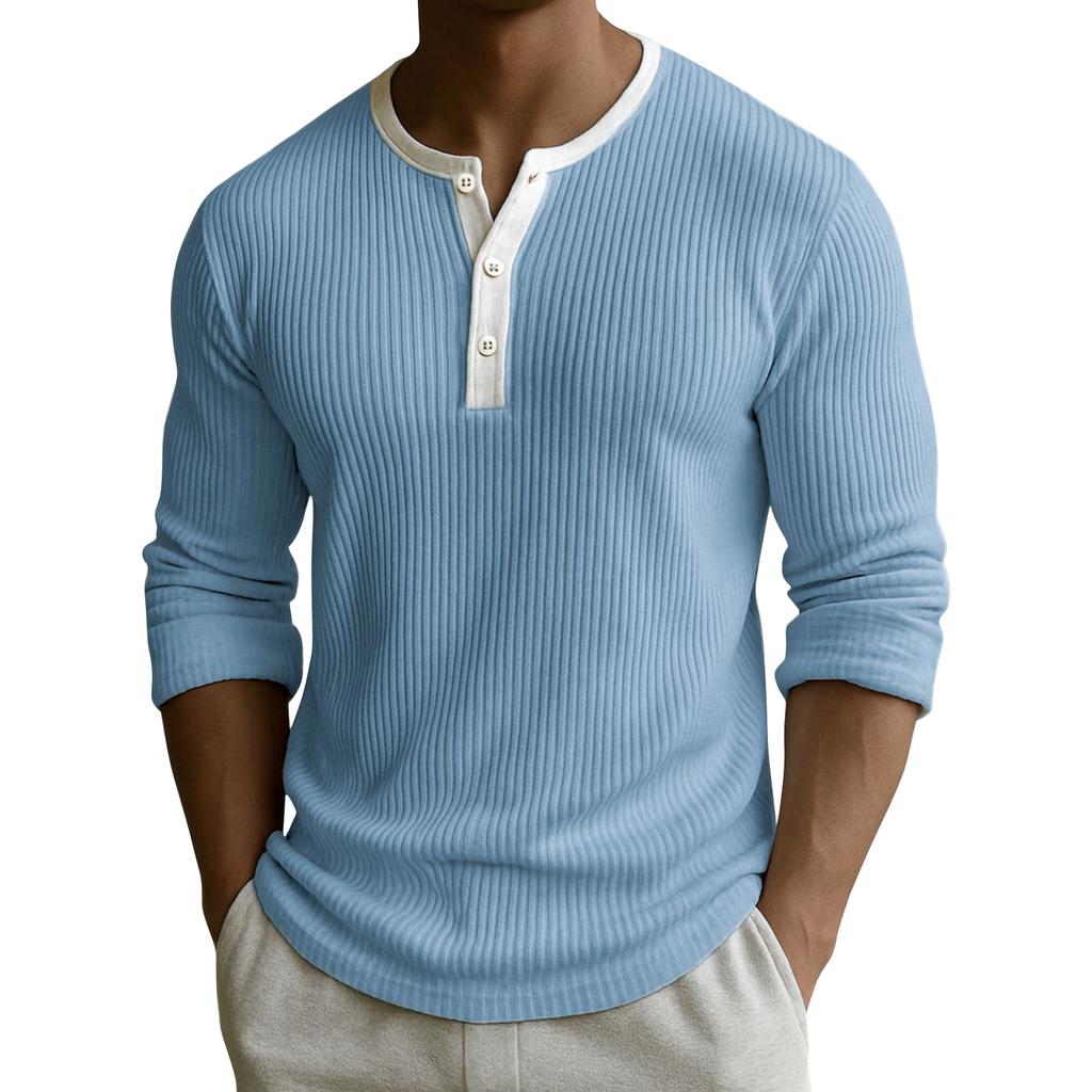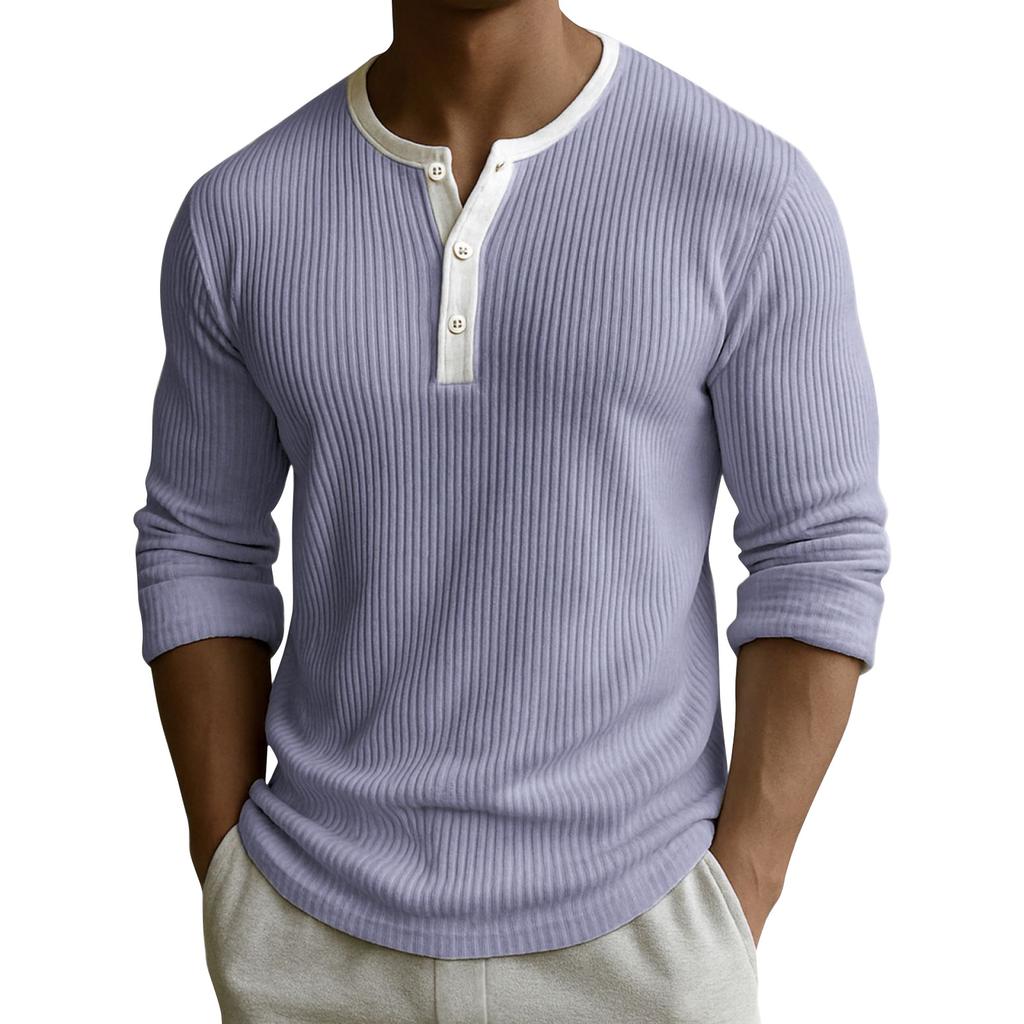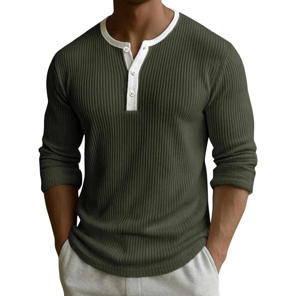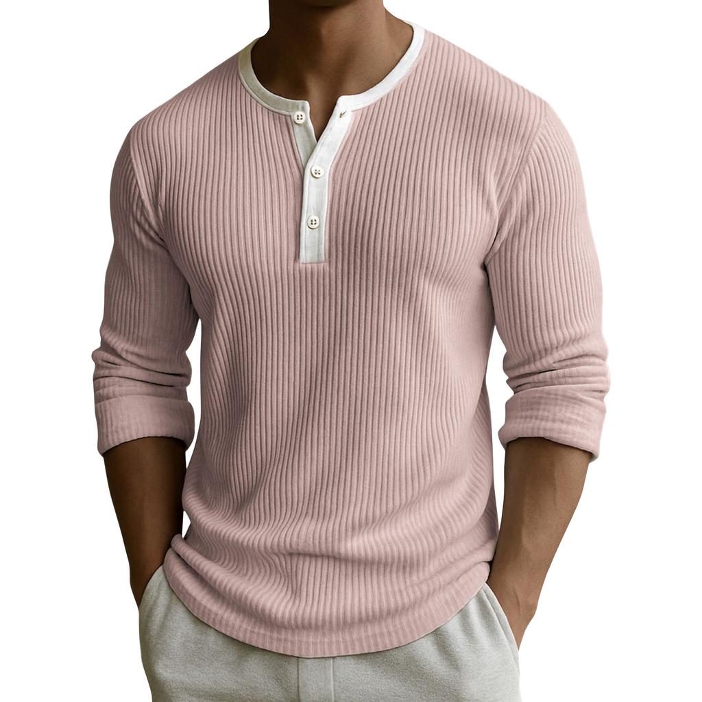 Мужской однотонный топ с рубчатой текстурой, на пуговицах, с круглым вырезом и длинными рукавами