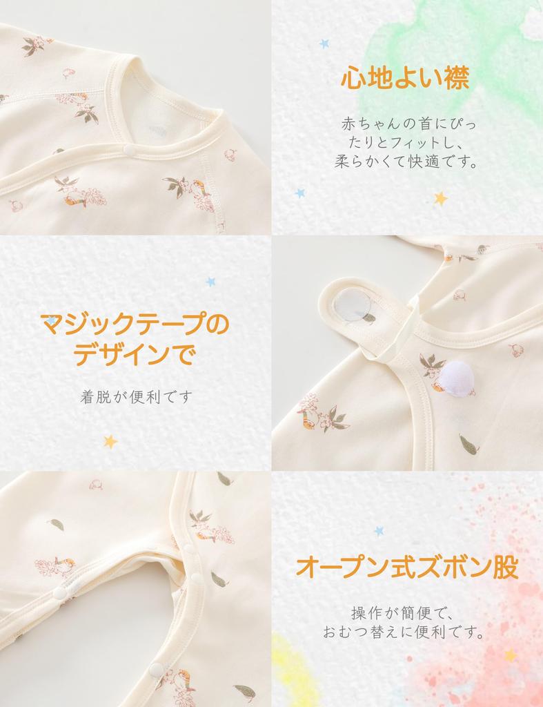 Строчка красивая, а воротник эластичный. Швы нежны к нежной коже, с внешними швами по бокам и под рукавами, чтобы предотвратить прямой контакт с нежной кожей младенцев, которая тоньше, чем у взрослых. Цельный дизайн позволяет малышам свободно двигаться, а животик закрыт, что делает его отличной альтернативой пижаме.. Большая ластовица в области промежности обеспечивает достаточно места для ягодиц ребенка, даже в подгузнике, и позволяет легко двигаться.
