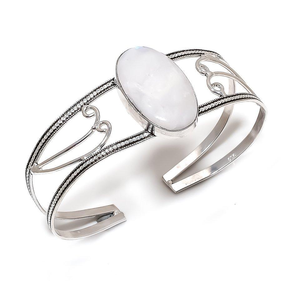 Натуральный Лунный Камень Драгоценный Камень 925 Стерлинговое Серебро Манжета Браслет Регулируемый v7K17