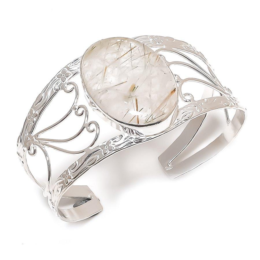 Натуральный Золотистый Рутил Драгоценный Камень 925 Стерлинговое Серебро Манжета Браслет Регулируемый N4v16