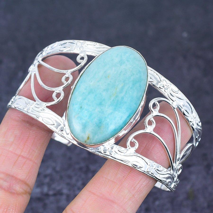 Натуральный Амазонит Драгоценный Камень 925 Стерлинговое Серебро Манжета Браслет Регулируемый N4G59