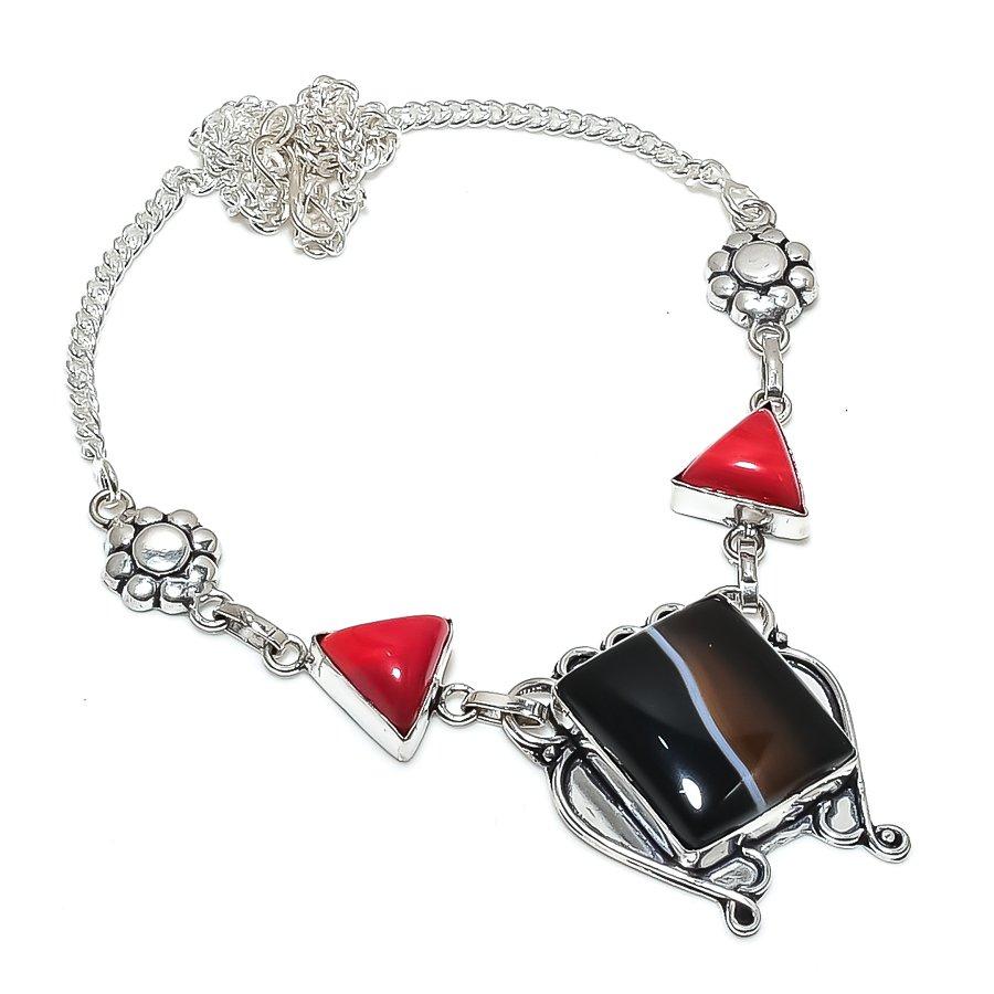 Натуральный полосатый агат, коралл, ювелирное изделие из серебра 925 пробы, колье 18" N6N54