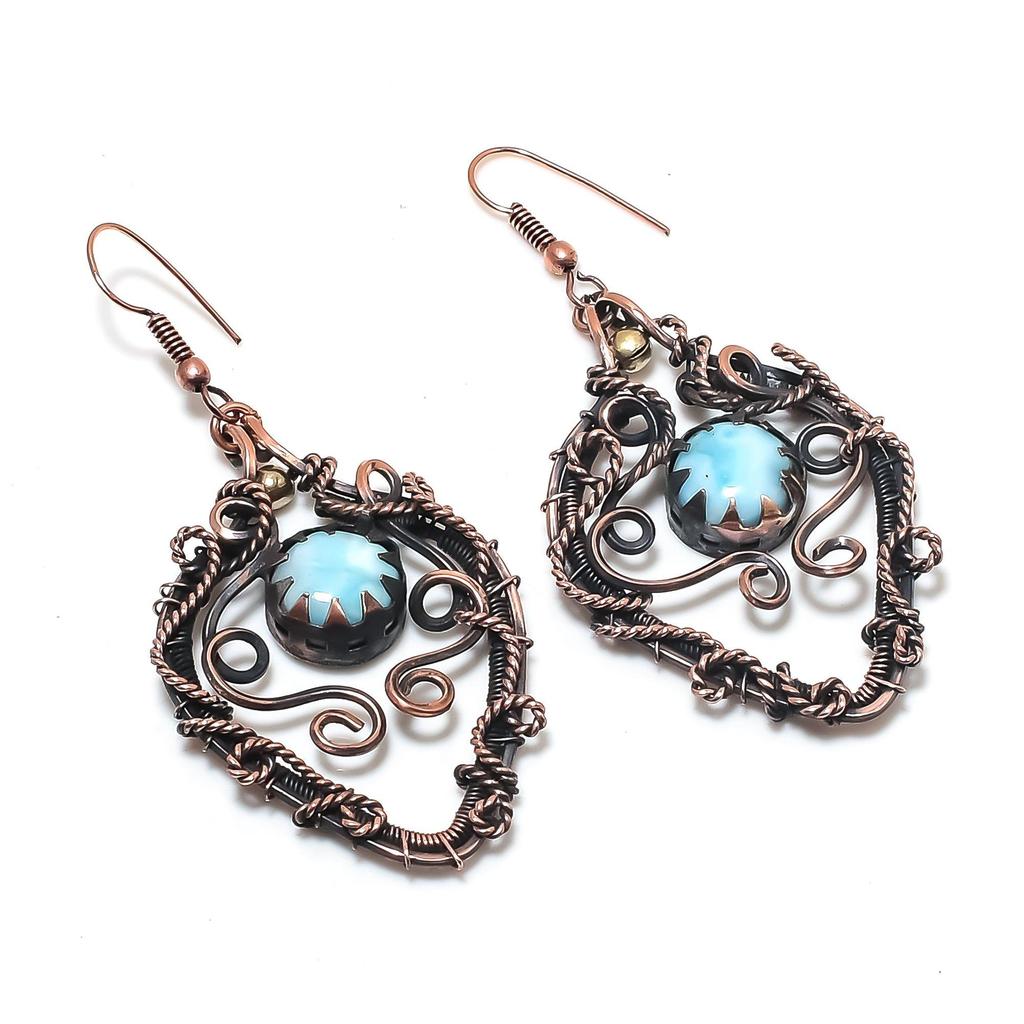 Серьги с ларимаром, Серьги с драгоценными камнями ручной работы, Серьги, обернутые медной проволокой 999 пробы, Антикварные украшения, Для подарка на помолвку