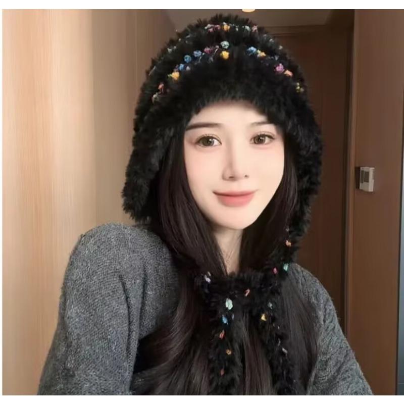 Кисло-сладкая шапка-бини с кисточкой, шнуровкой и плюшевой вязкой для женщин на осень и зиму, японская милая шапка для защиты от холода и защиты ушей