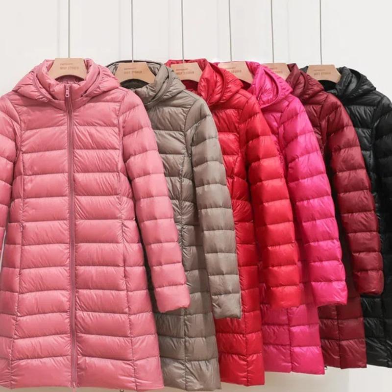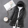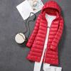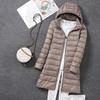 Новая легкая пуховая куртка для женщин на осень и зиму, длинная, из белой утиной ткани, корейская версия, легкая ветровка, тонкая куртка со съемной шапочкой, теплая куртка.