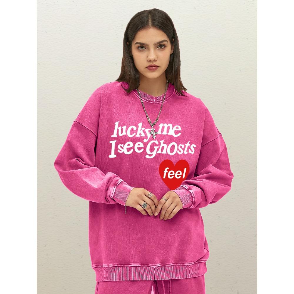 Мне повезло, я вижу призраков, художественный принт с надписью, женский свитшот с эффектом стирки, мягкий хлопок, уличная одежда, свободная спортивная одежда, топ с круглым вырезом